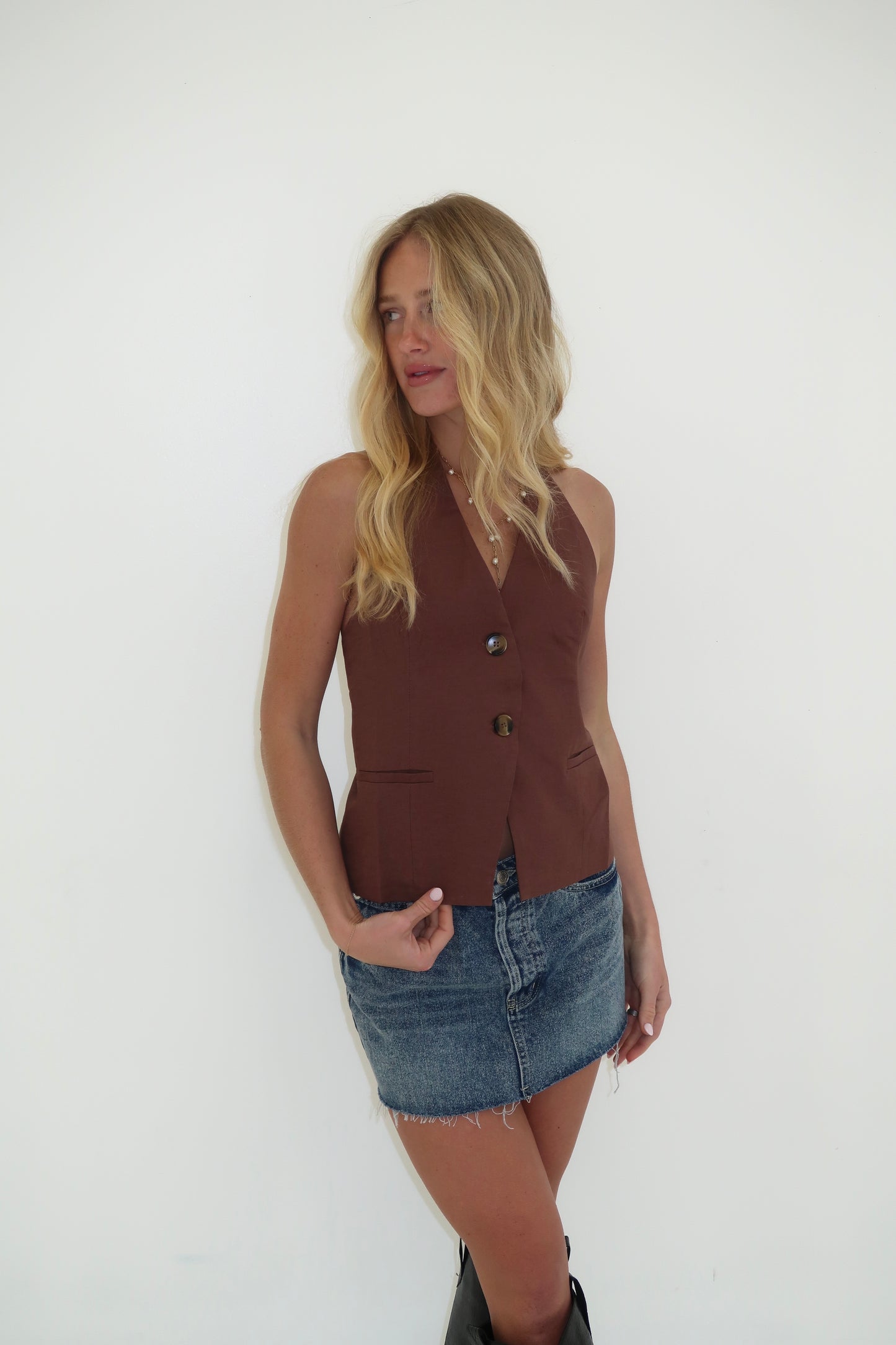 Cotton linen blend vest top. Open back. Halter tie.