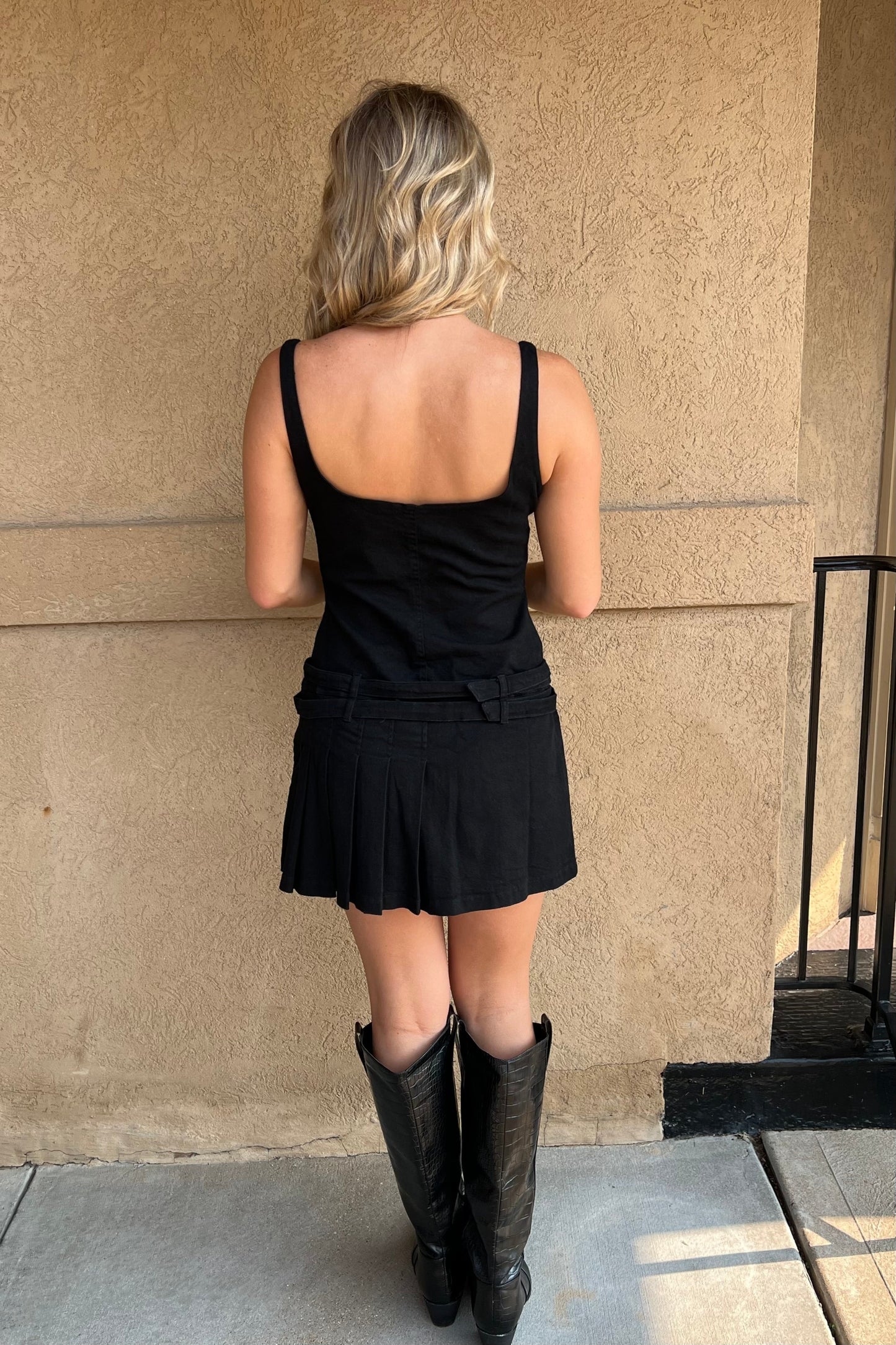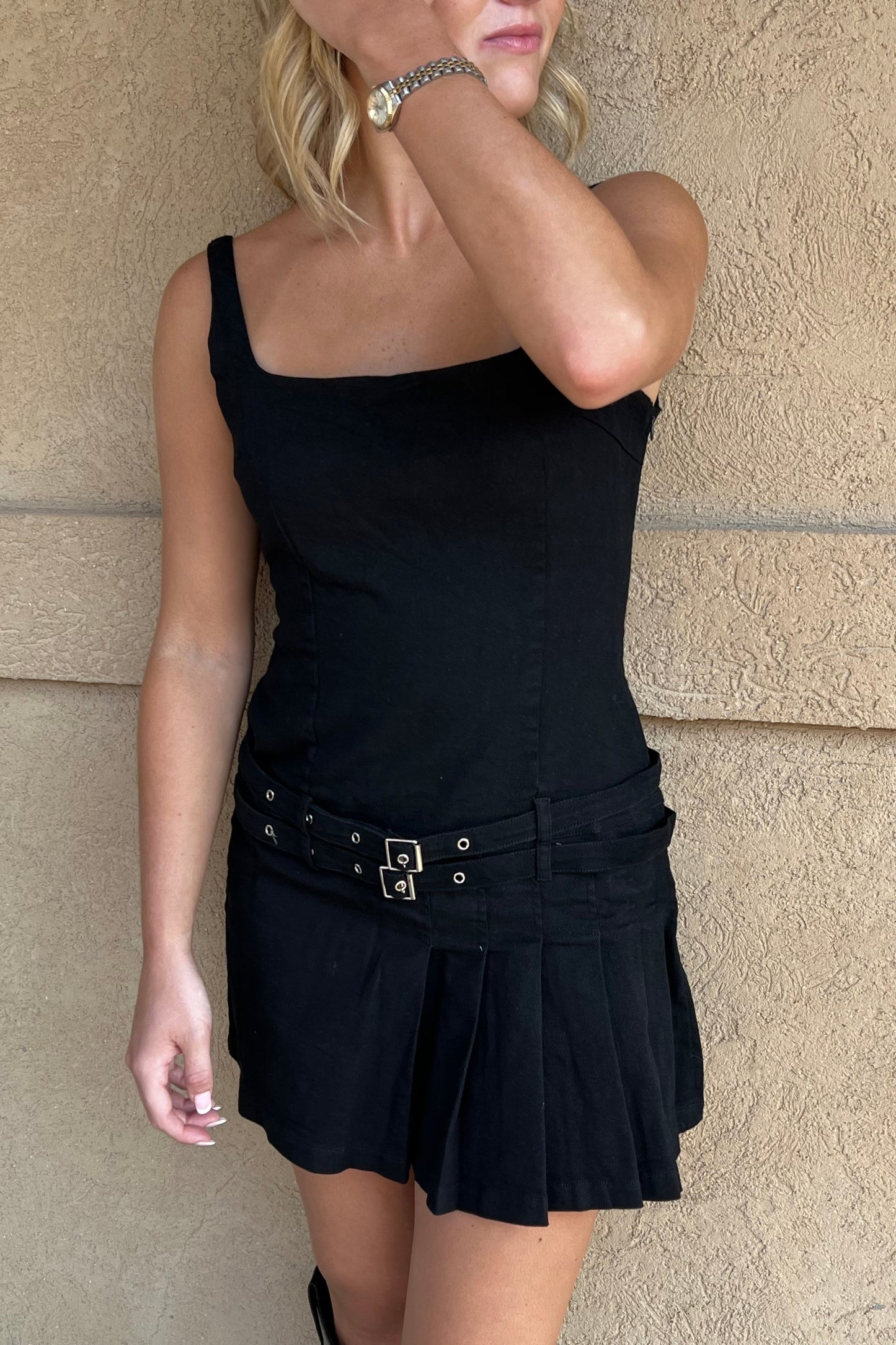 Washed twill woven dress. Pleated detailing & double belt. Side zipper closure.