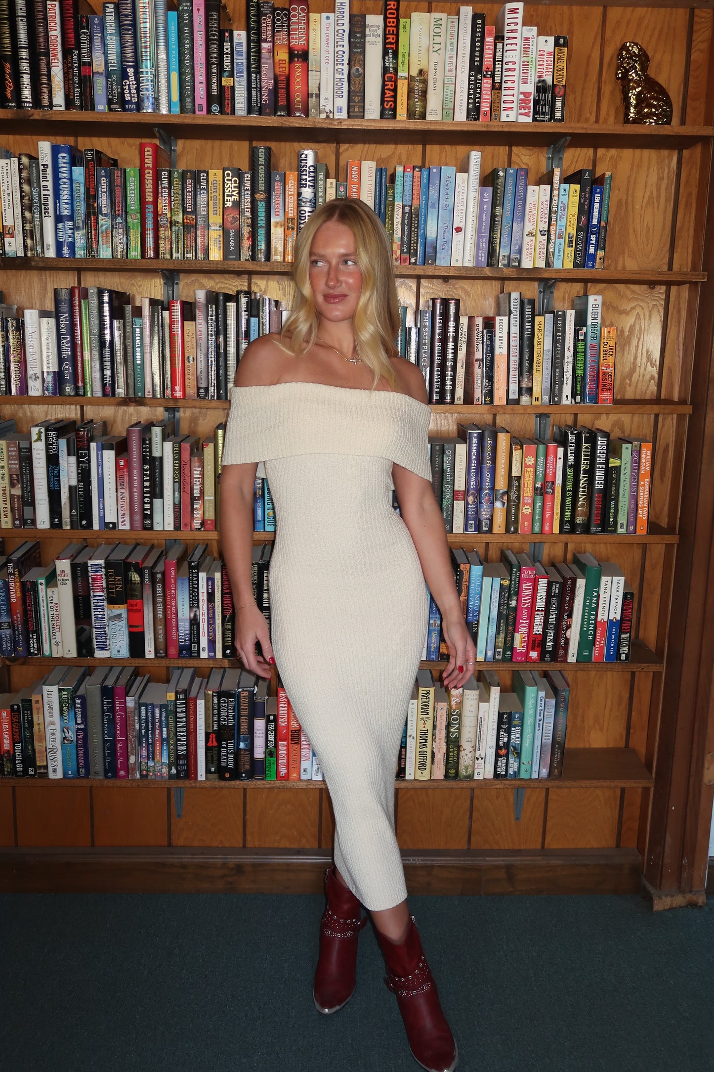 Cream strapless bodycon midi dress. Off the shoulder style.