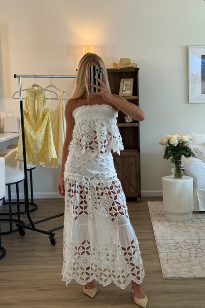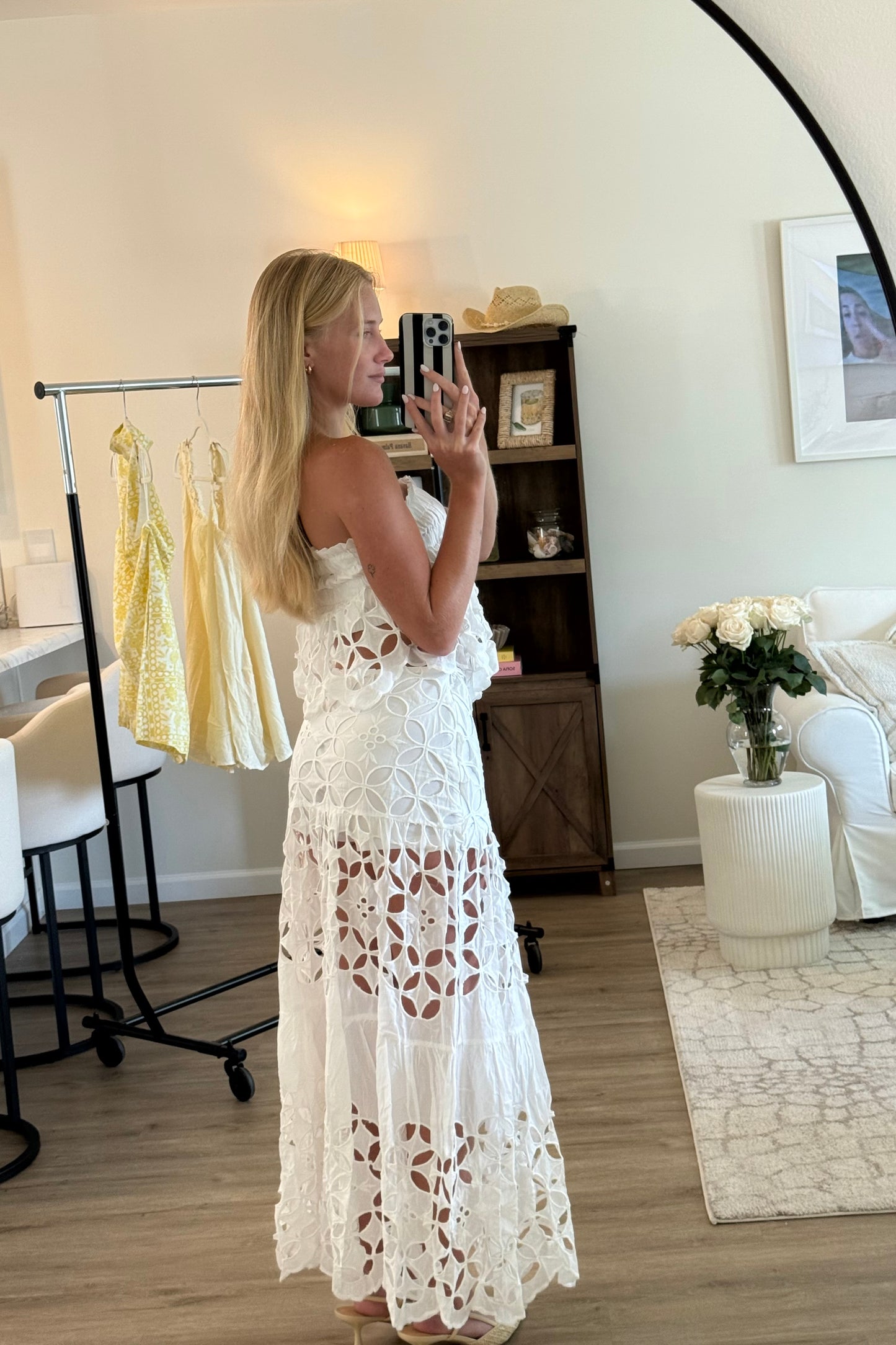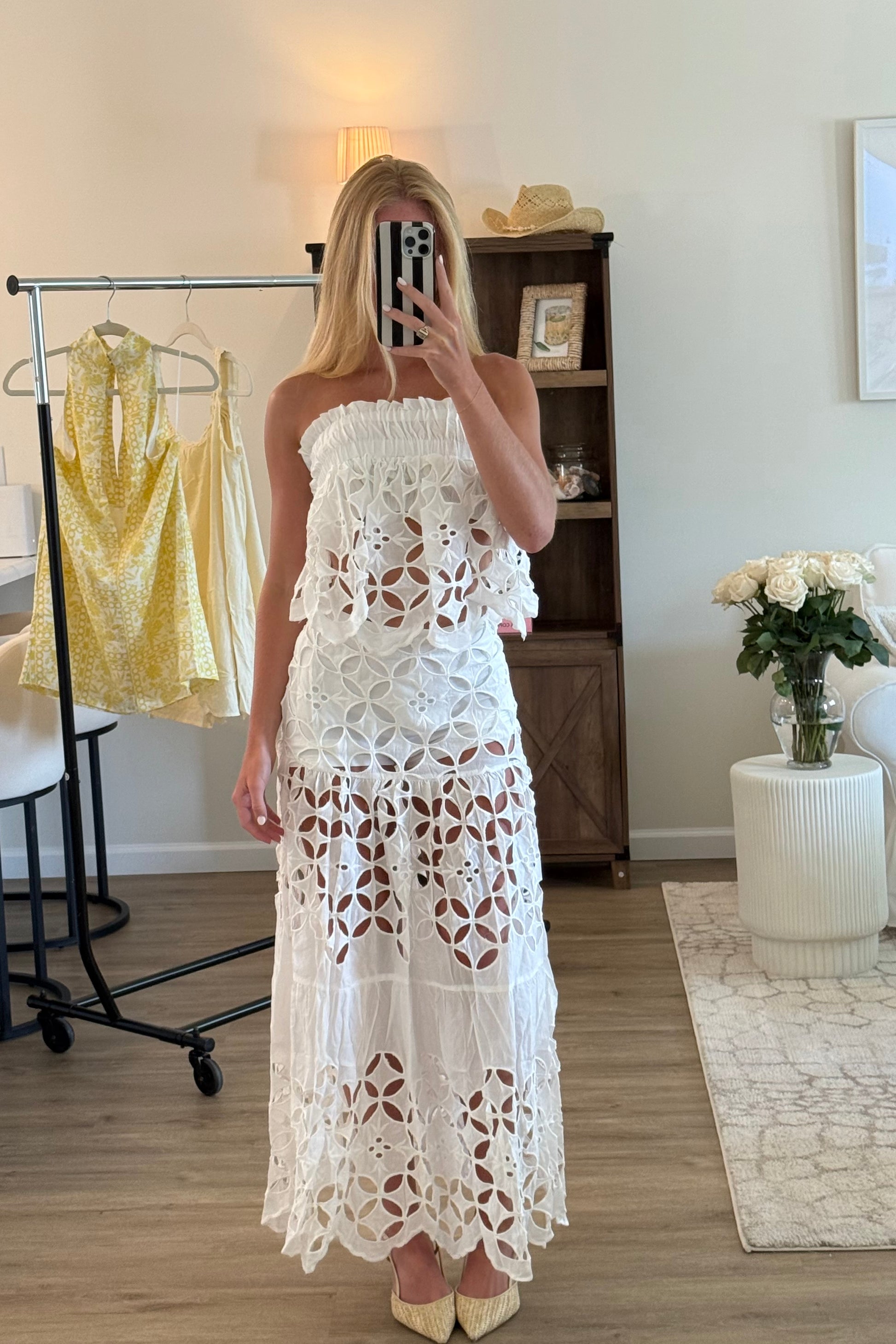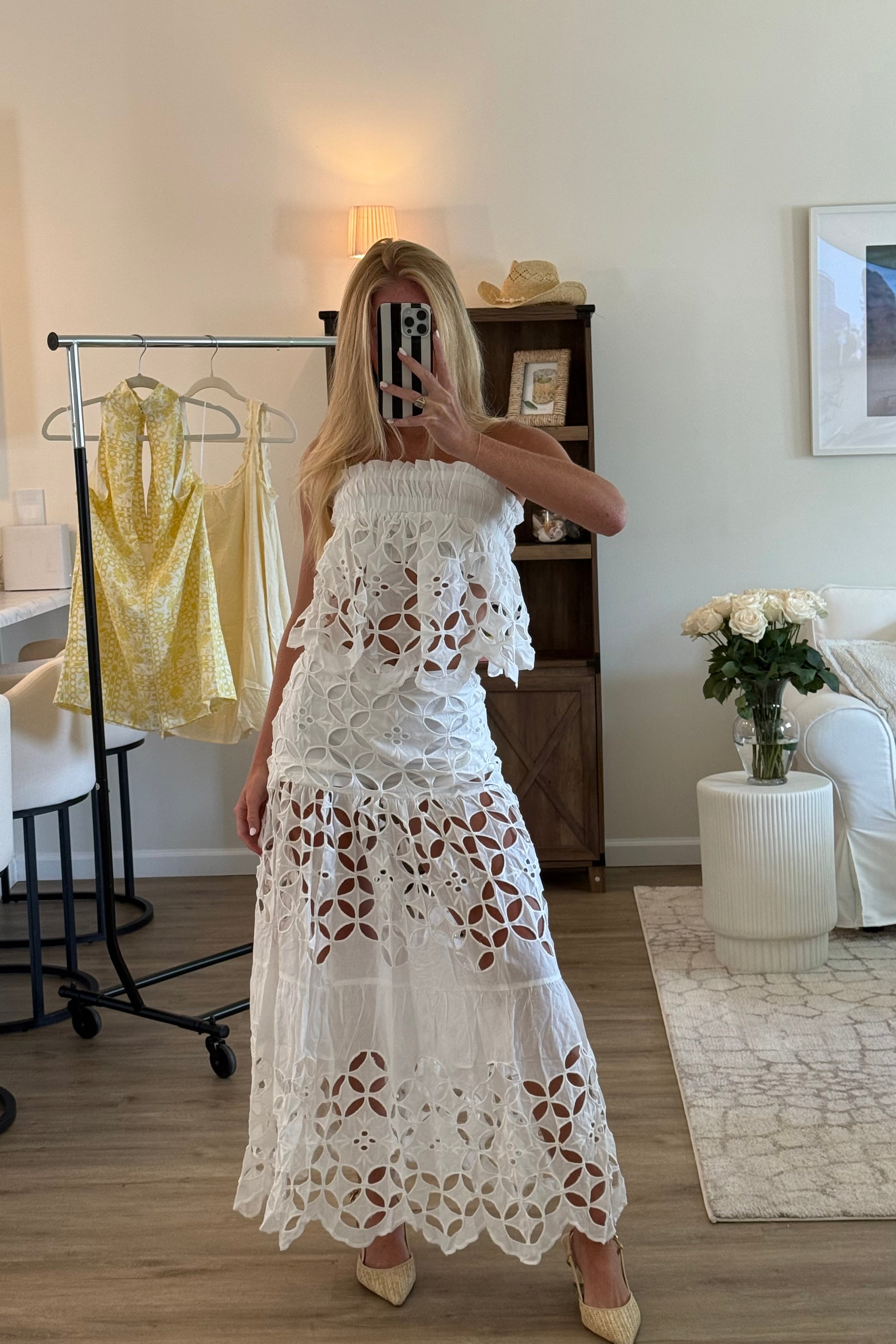 Skirt: Matching high-rise maxi skirt with tiered eyelet embroidery. Built-in shorts for coverage. Zipper closure with a scalloped hemline.