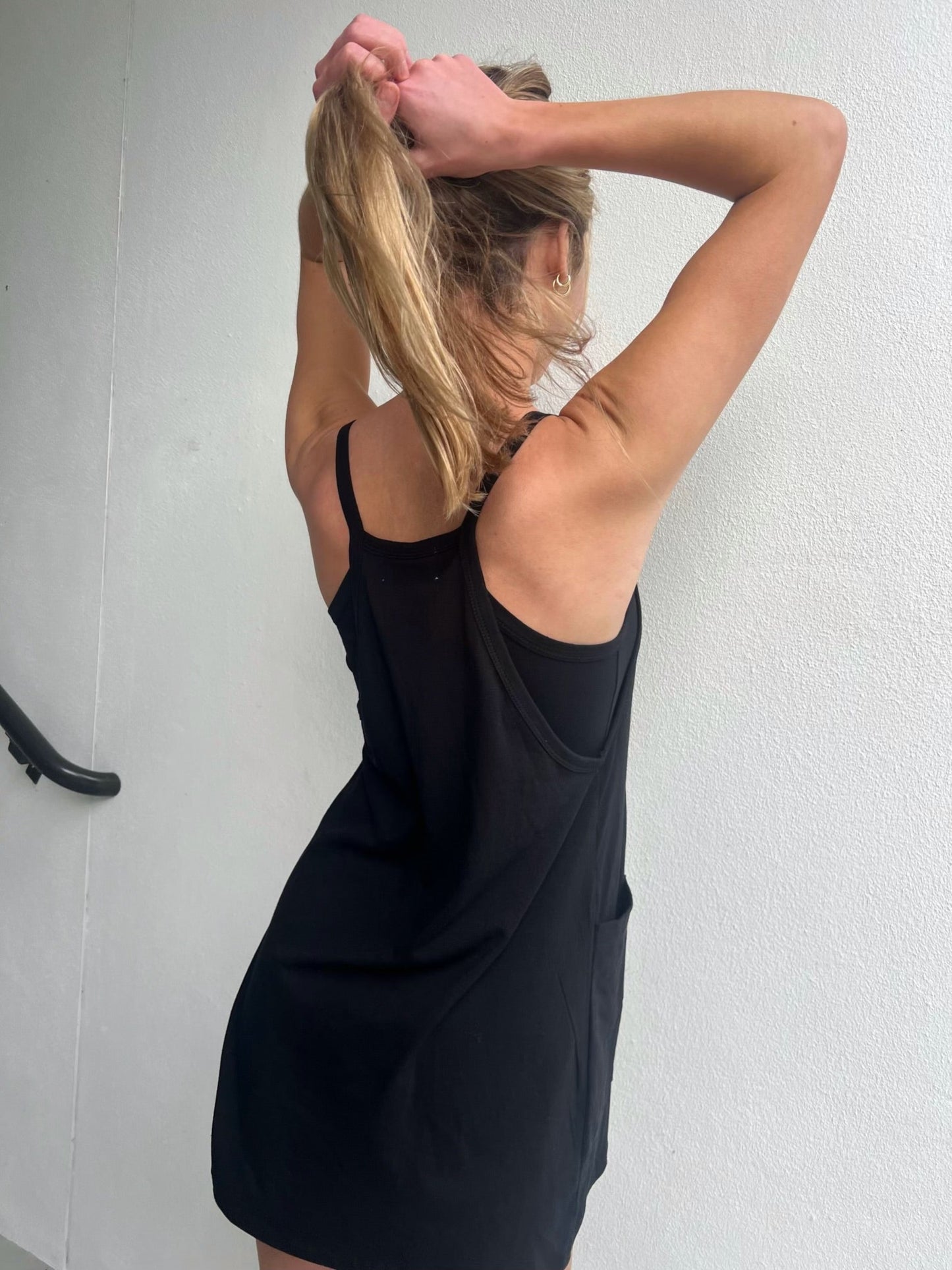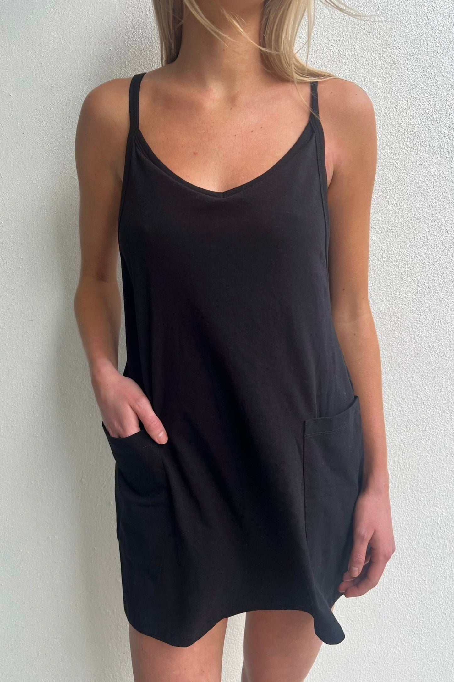 This soft dress features a mini-length and lightweight fabric with oversized patch pockets and a built in romper.