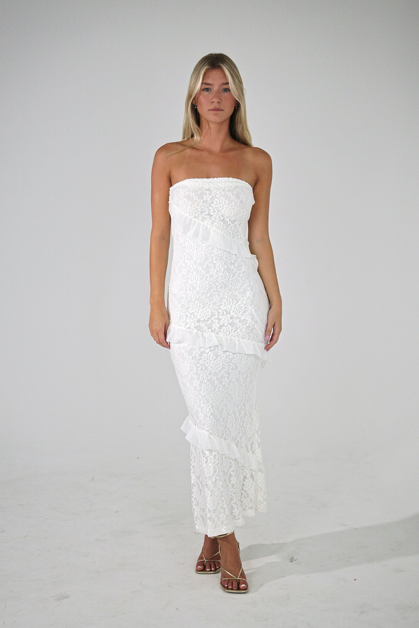 Strapless maxi dress. Lace & ruffle detailing. Side zipper closure.