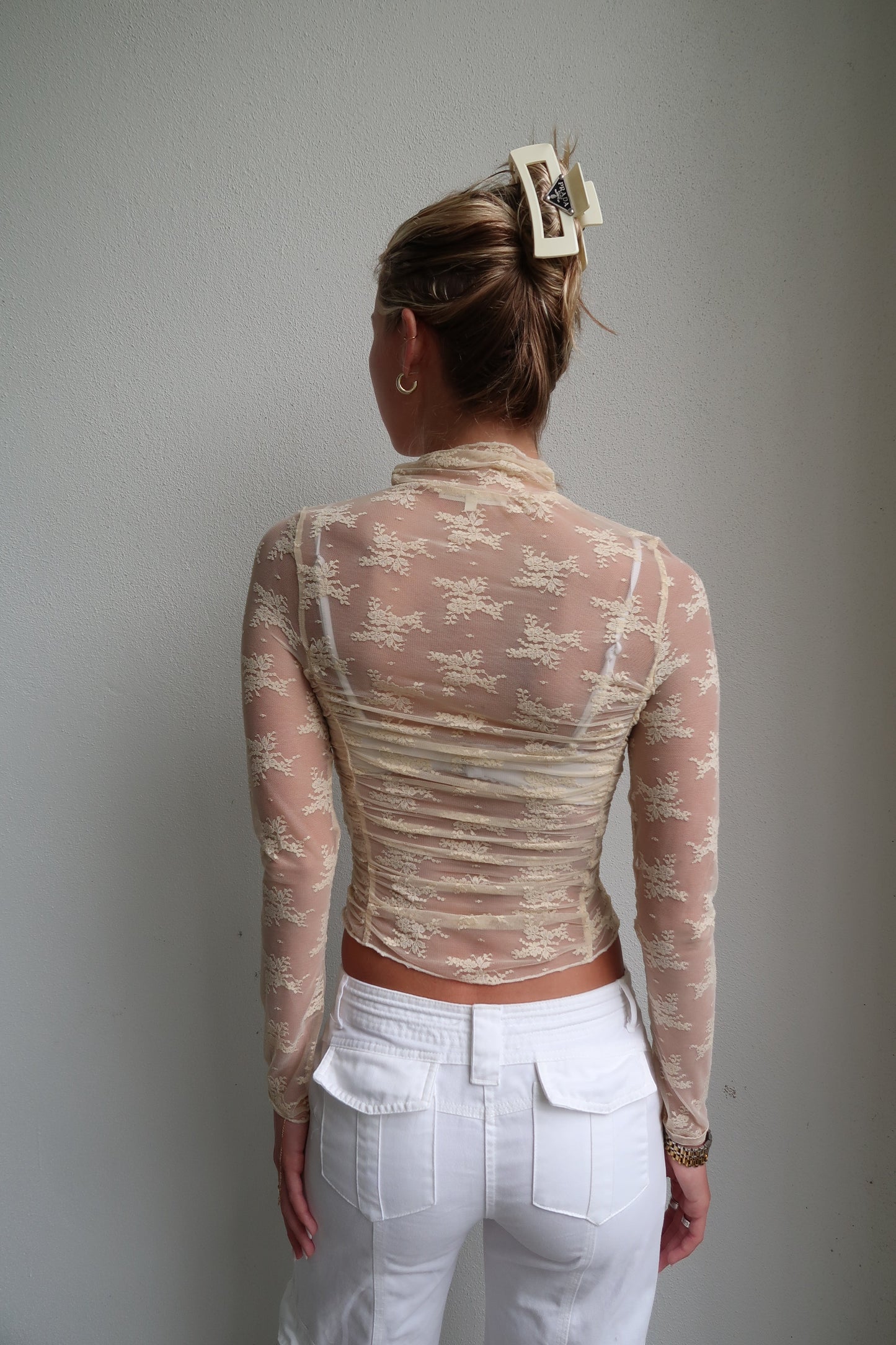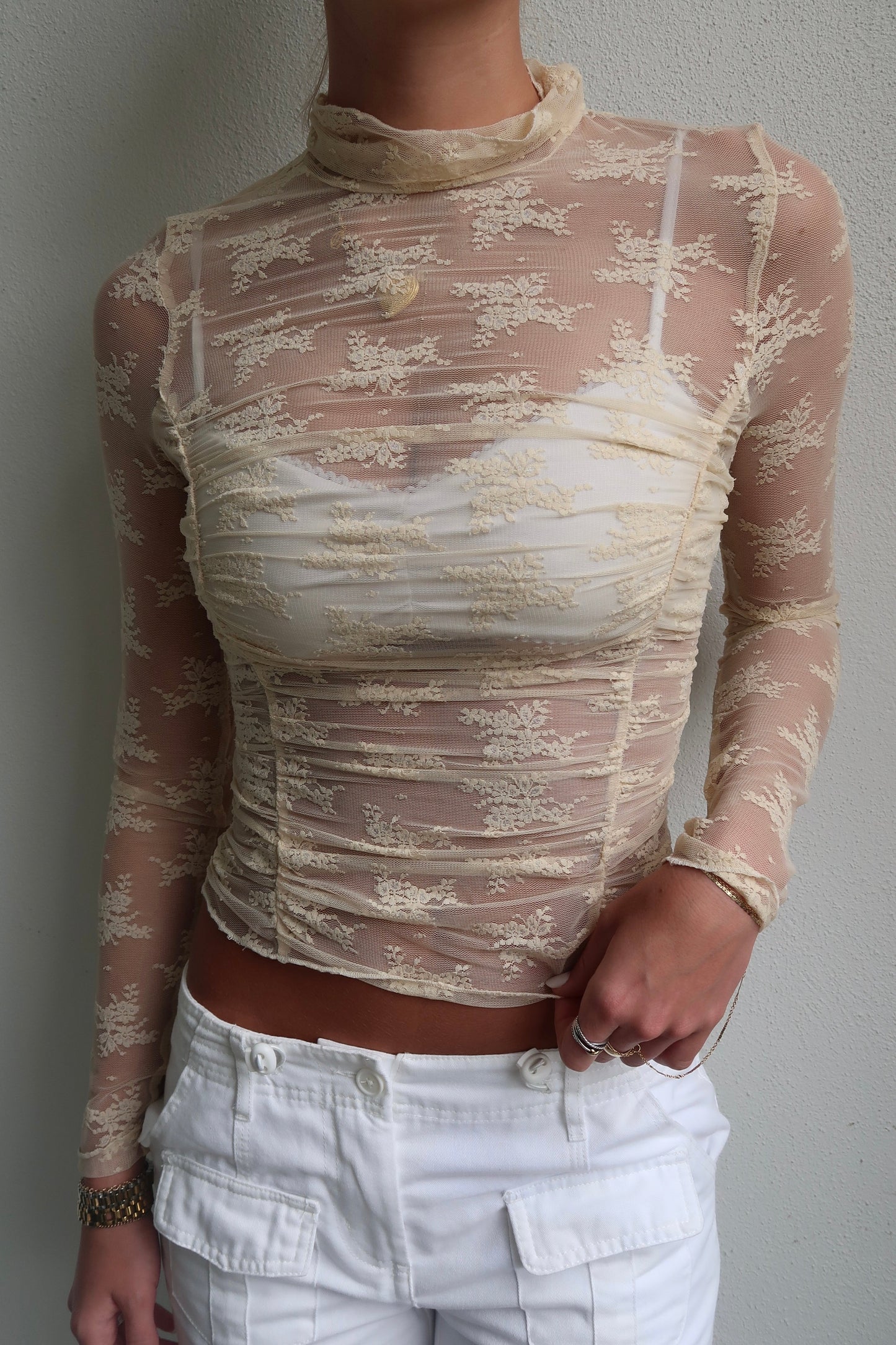 - cream mesh long sleeve with lace floral imprints