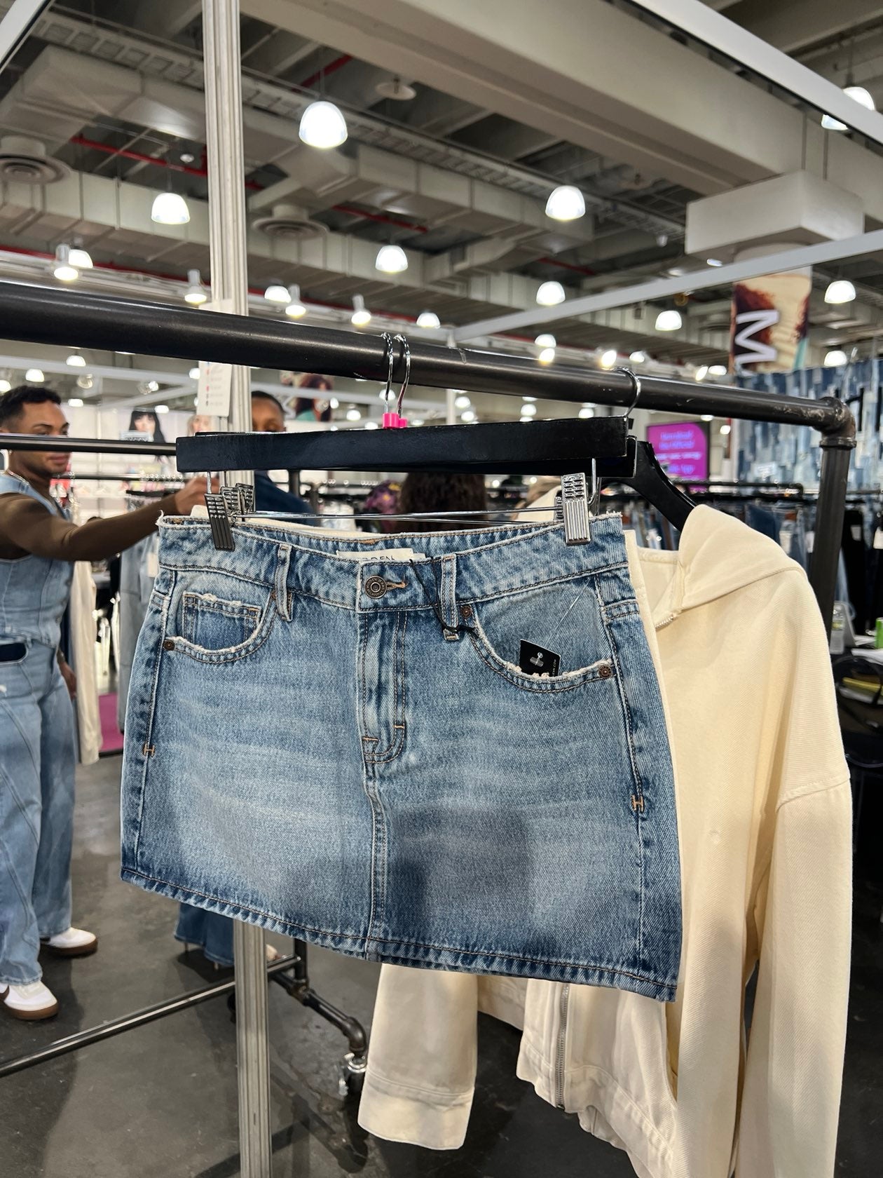 12.5” length. Low Rise mini skirt. Light medium wash.