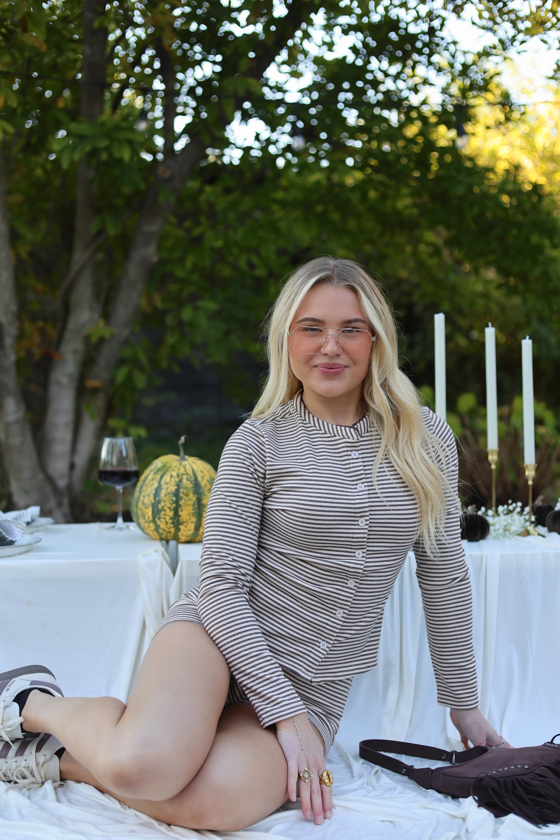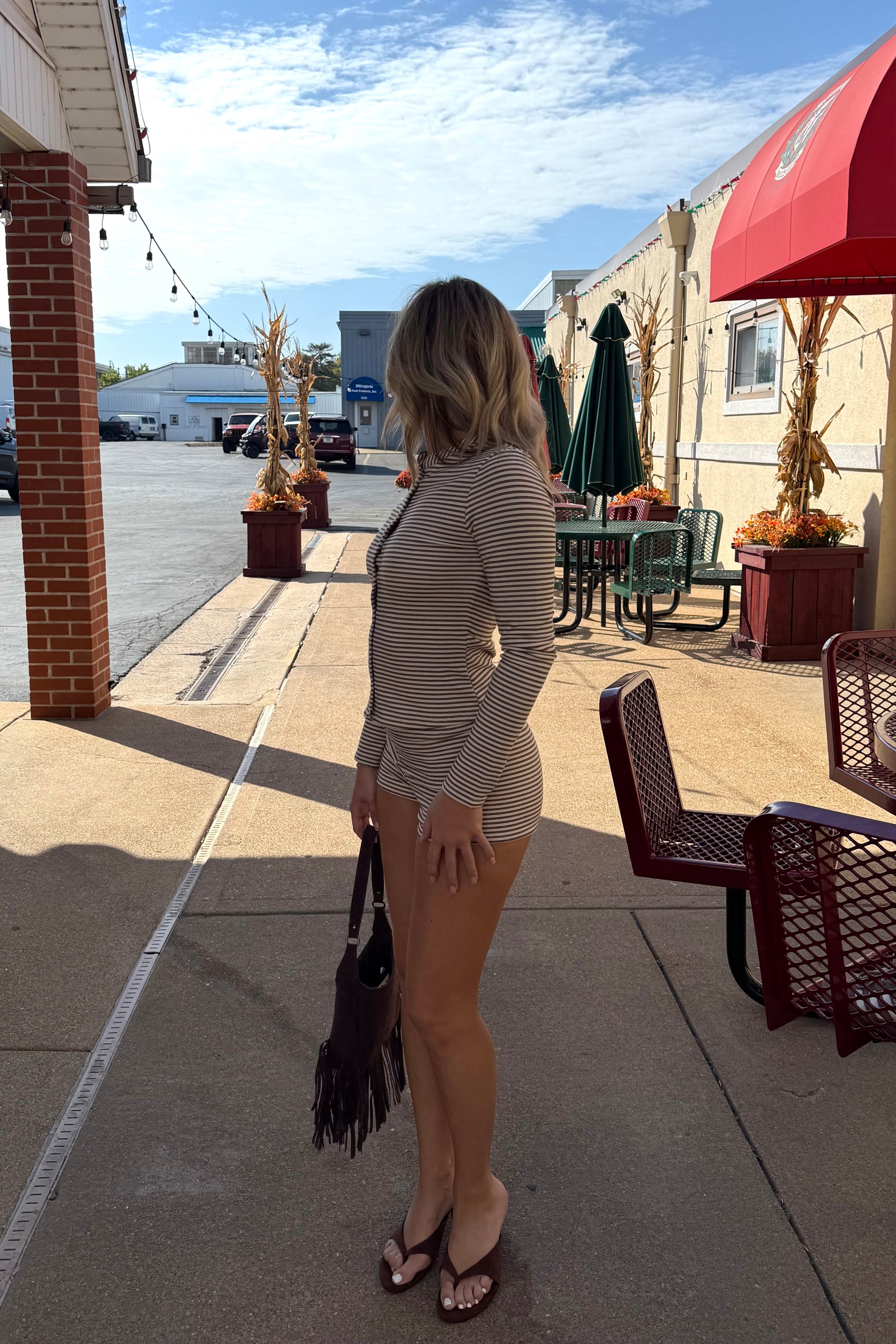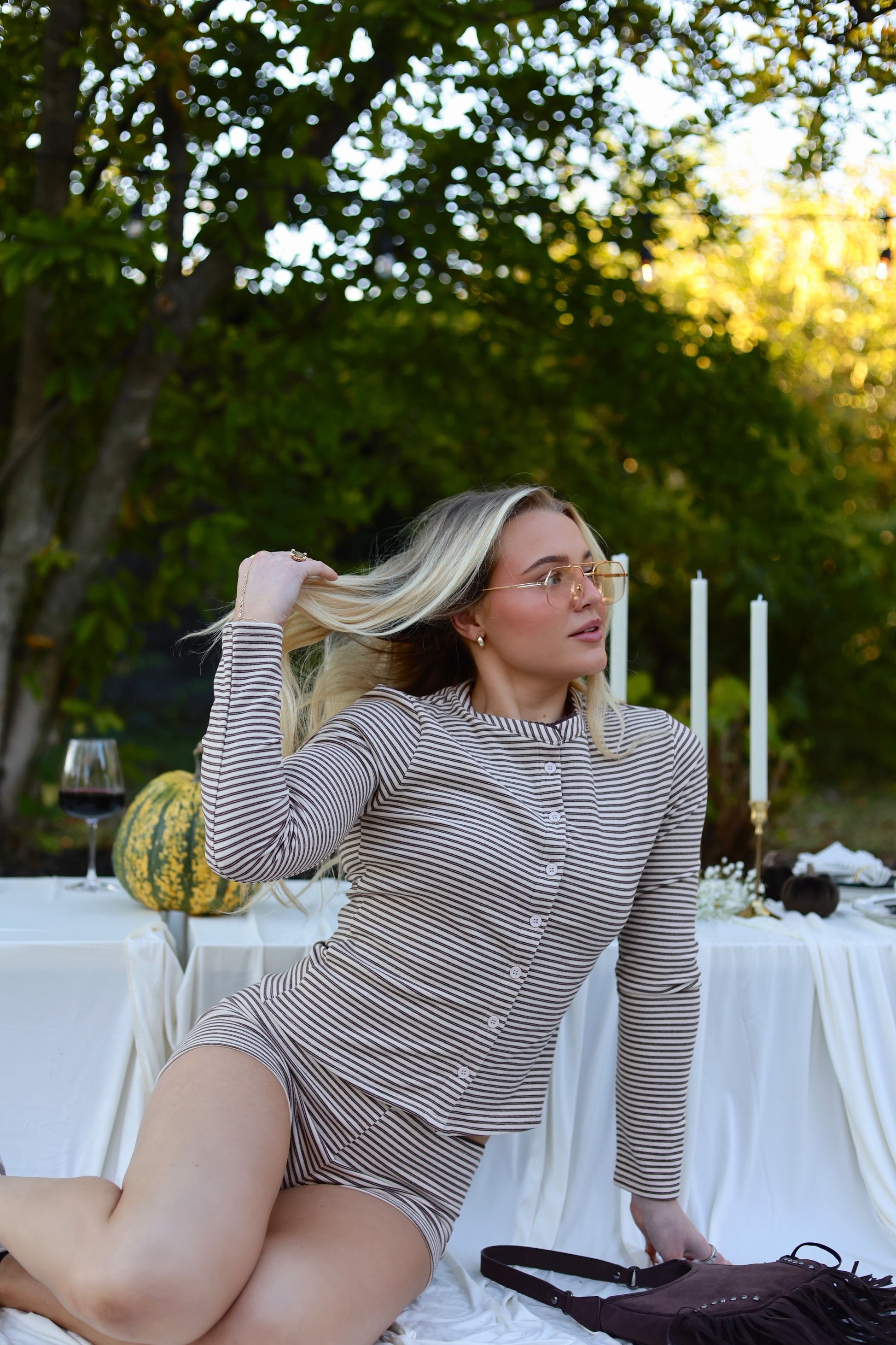 Striped knit lounge set featuring a long sleeve button-up top and matching shorts. Soft cotton-blend fleece knit for all-day comfort. The top includes a crew neckline and full button front for easy styling, while the shorts feature a flattering low-rise waist and fitted silhouette. Effortless, coordinated, and can be styled up or down.