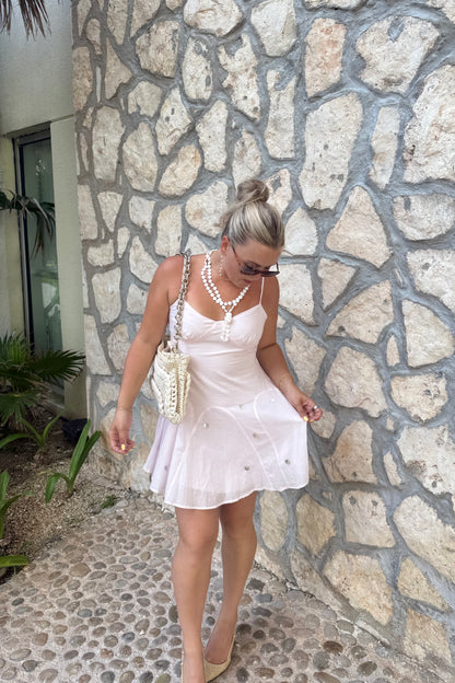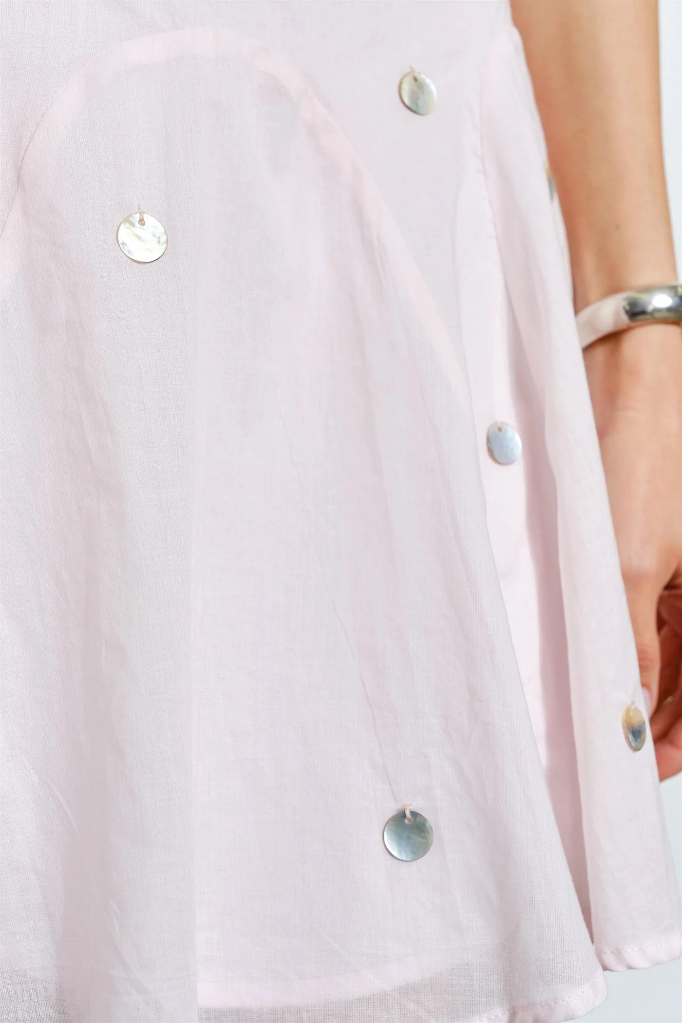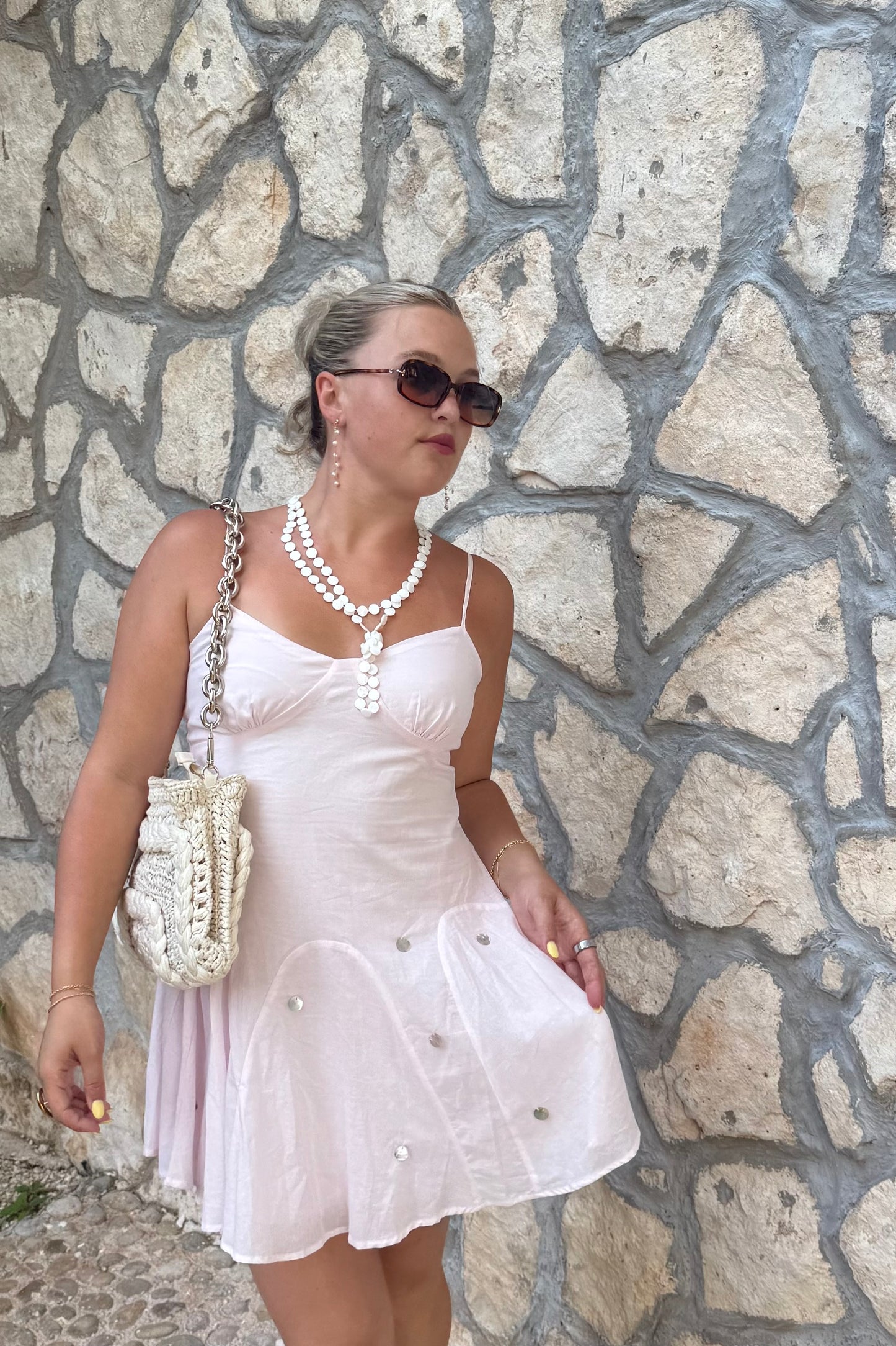 Blush pink mini dress. Slender adjustable spaghetti straps and a fitted bodice that flows into a flared godet skirt. Delicate mother of pearl trims are scattered across the skirt.