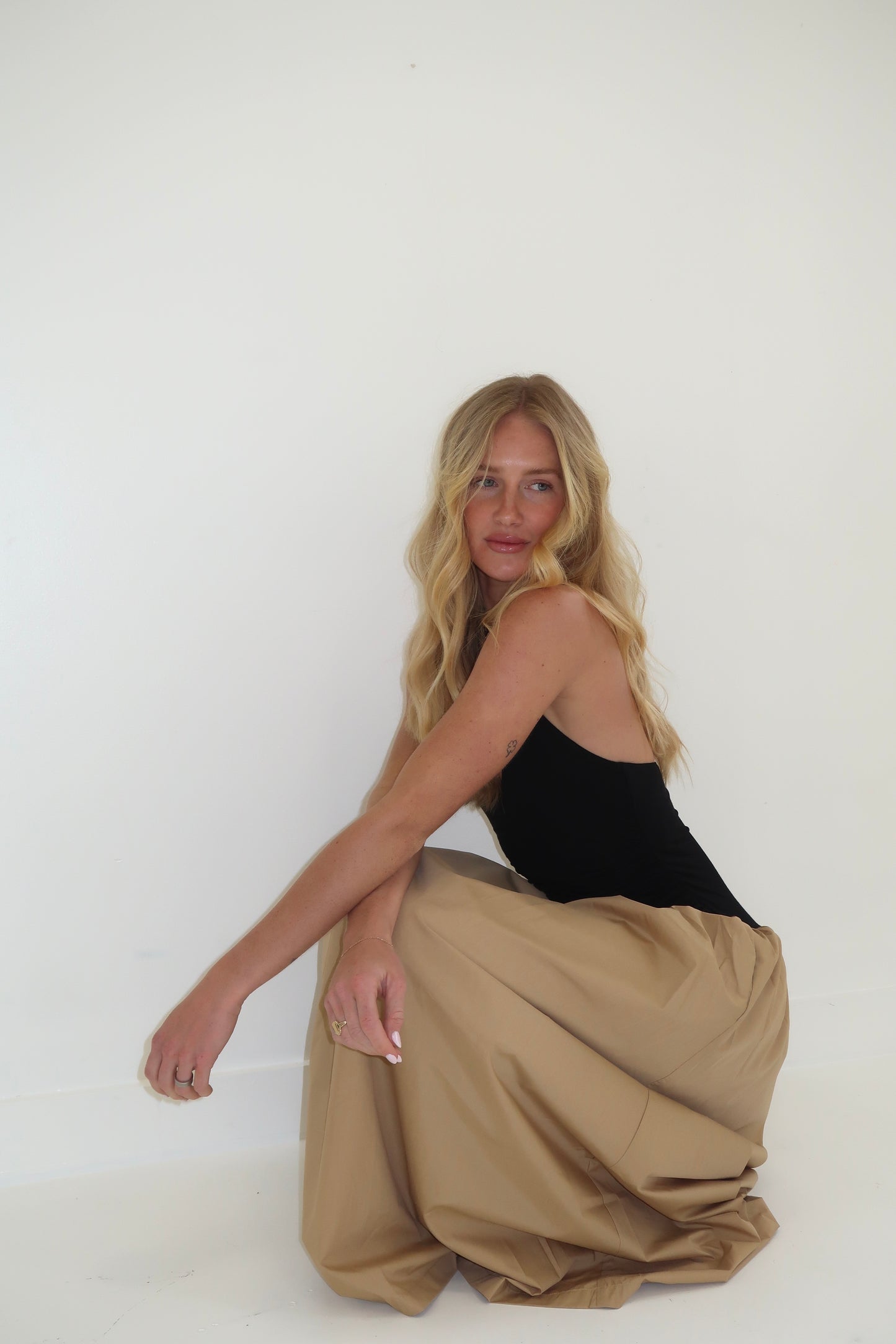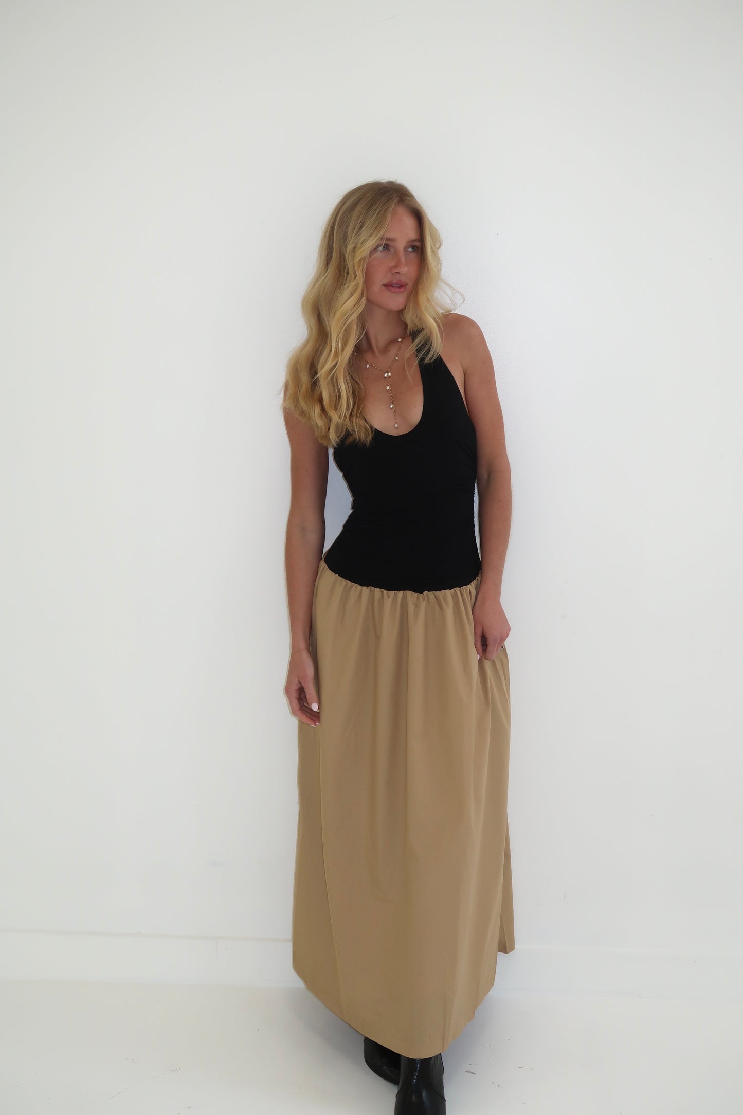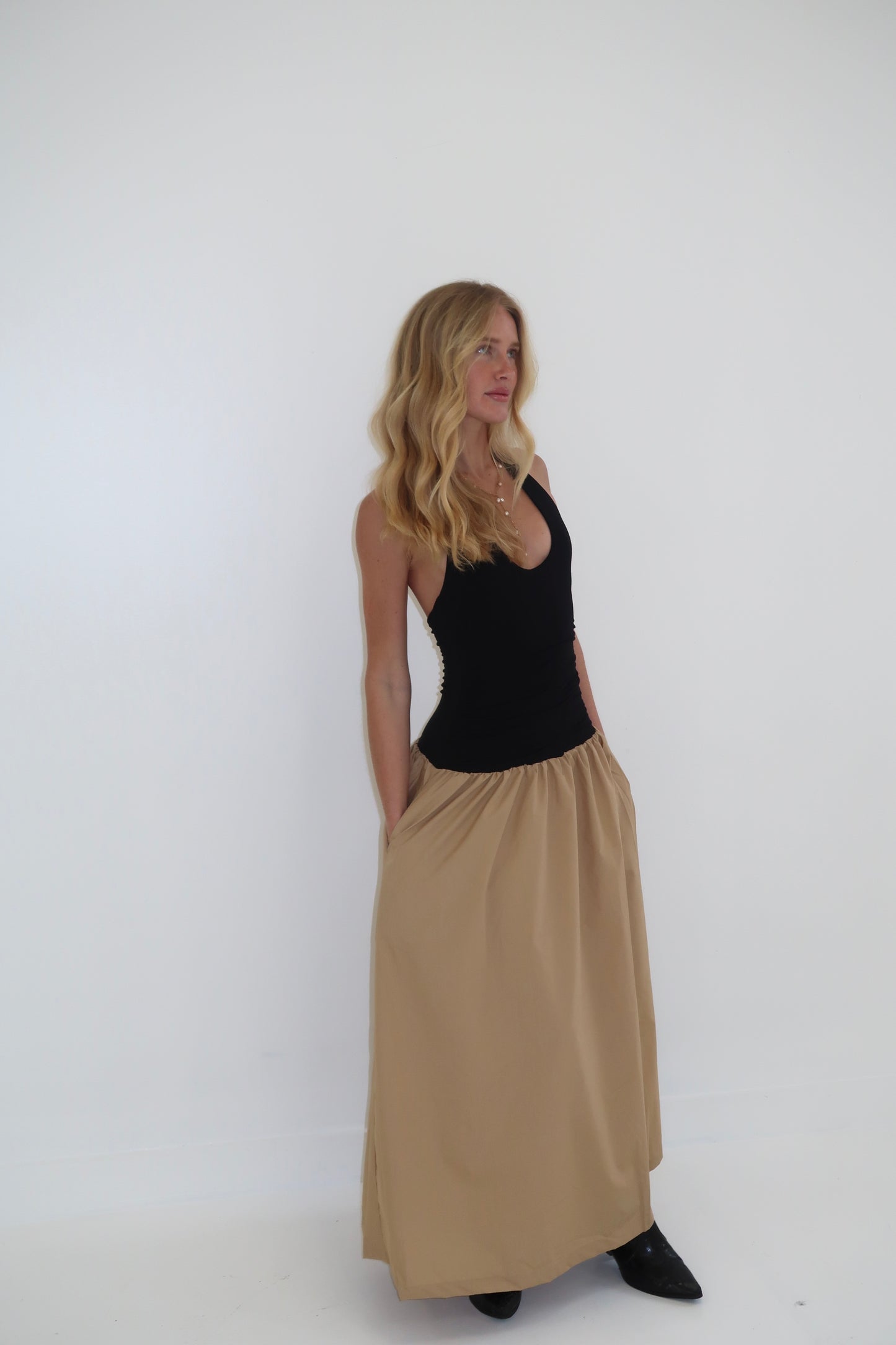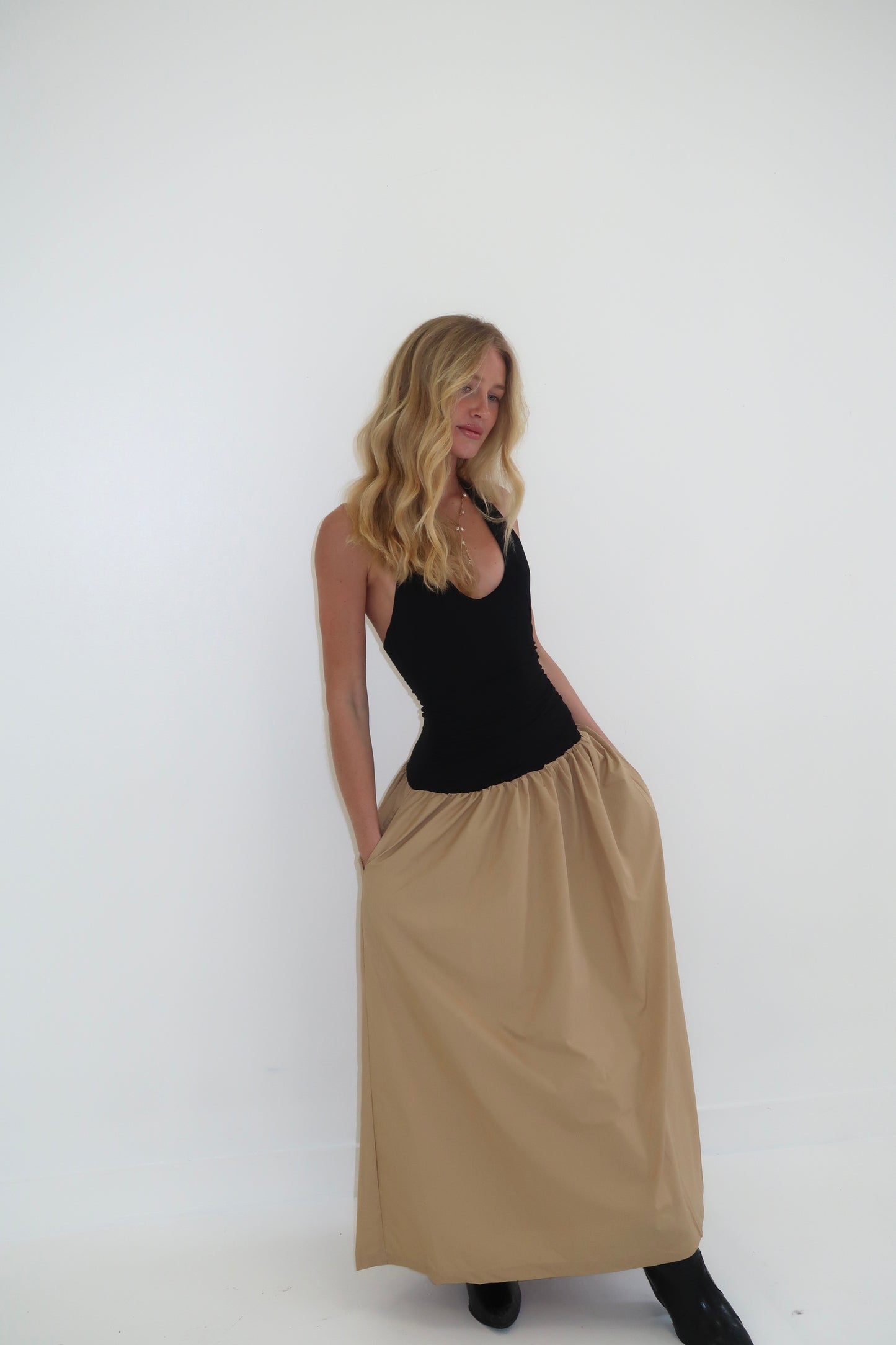 Color blocked maxi dress. Knit ruched bodice. Elastic halter neckline. Woven skirt. Side pockets. Fully lined.