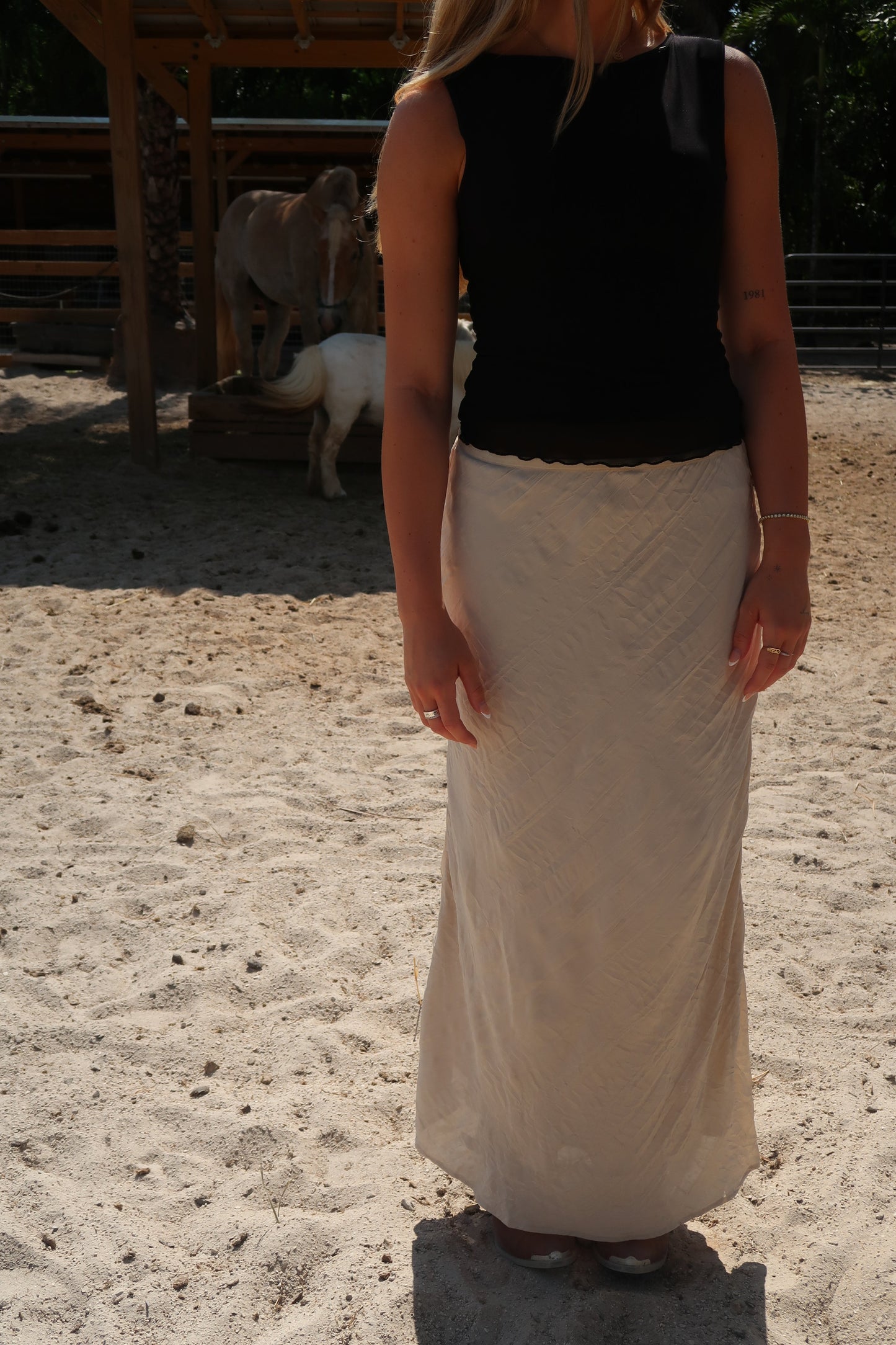 Bias-cut midi skirt. Cinch-detailing on sides. Fully lined.