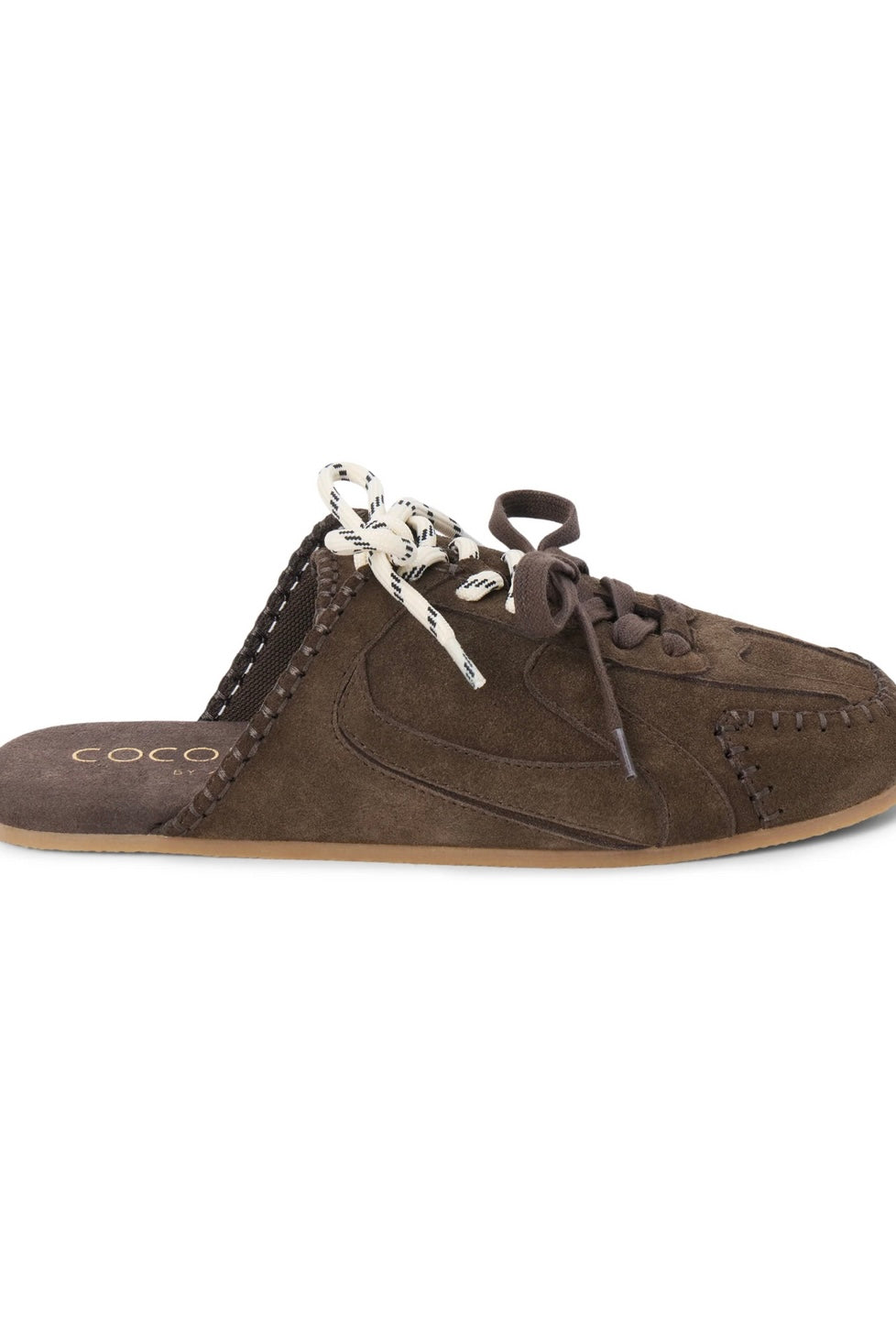 Suede mule with moccasin-style stitching, sporty lace-up detail, and open back. A laid-back hybrid silhouette blending slipper comfort with sneaker edge.