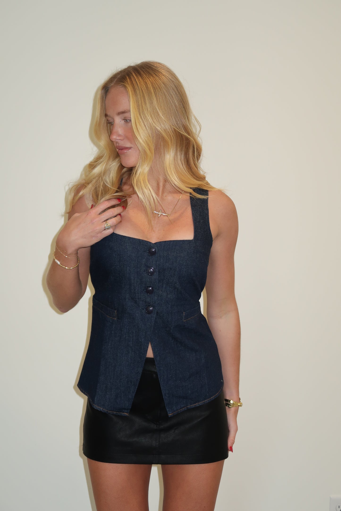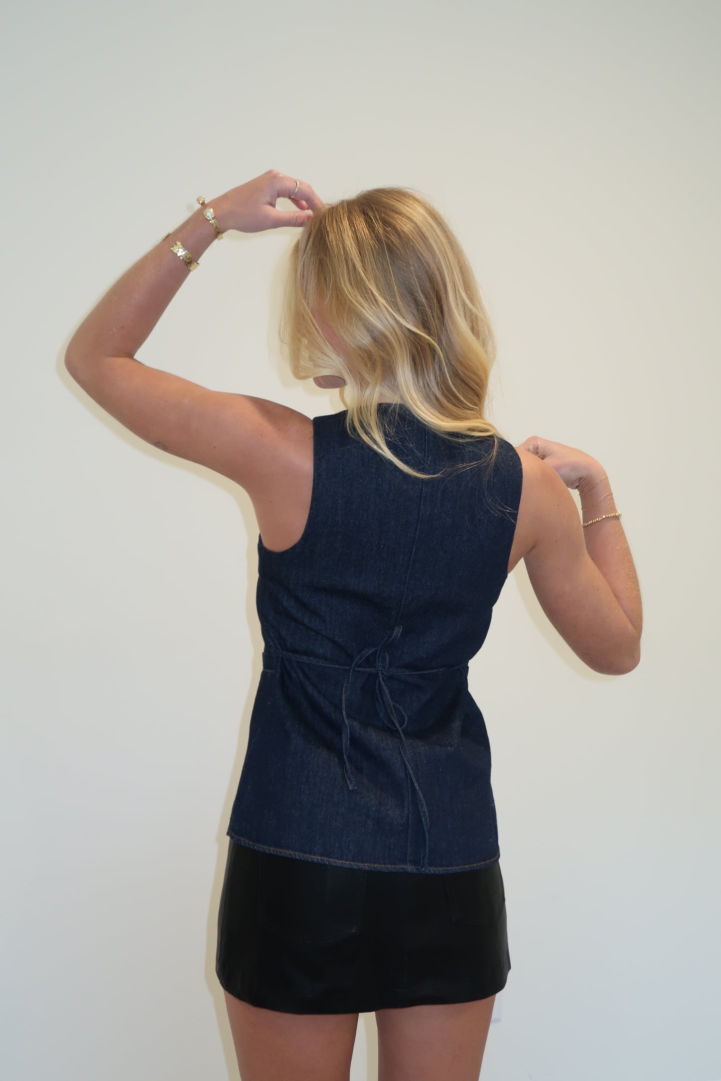 Denim sleeveless top. Fixed straps. Front button closure. Faux front pockets. Adjustable back tie.
