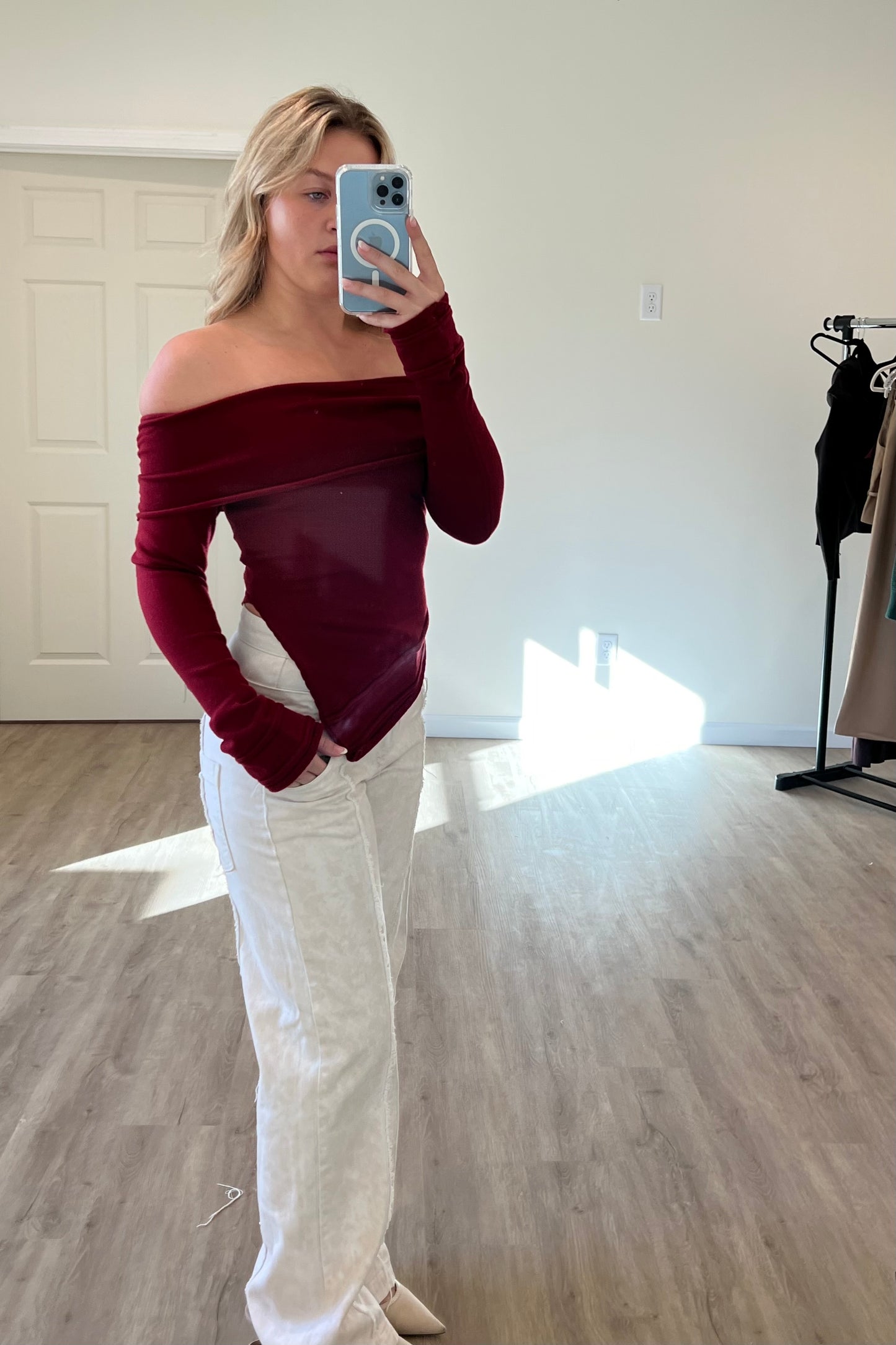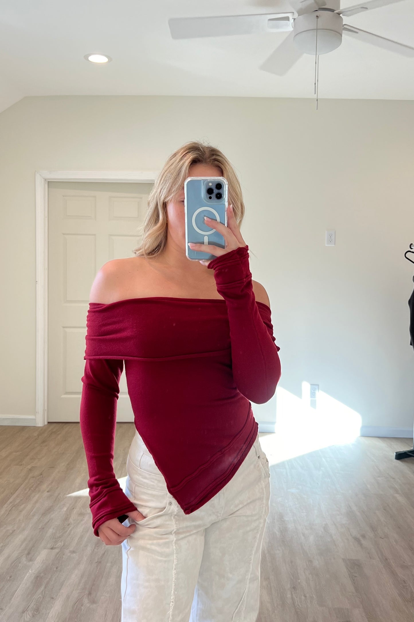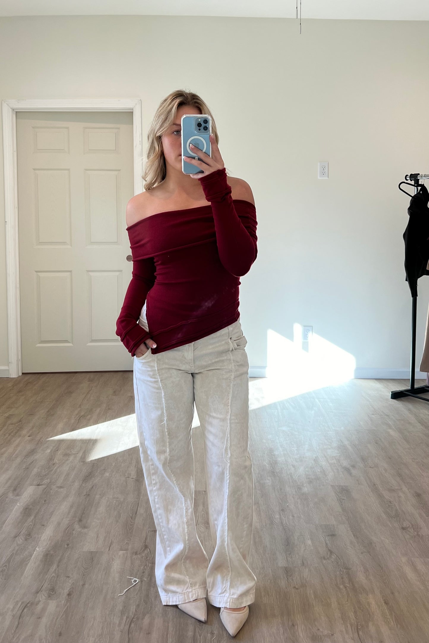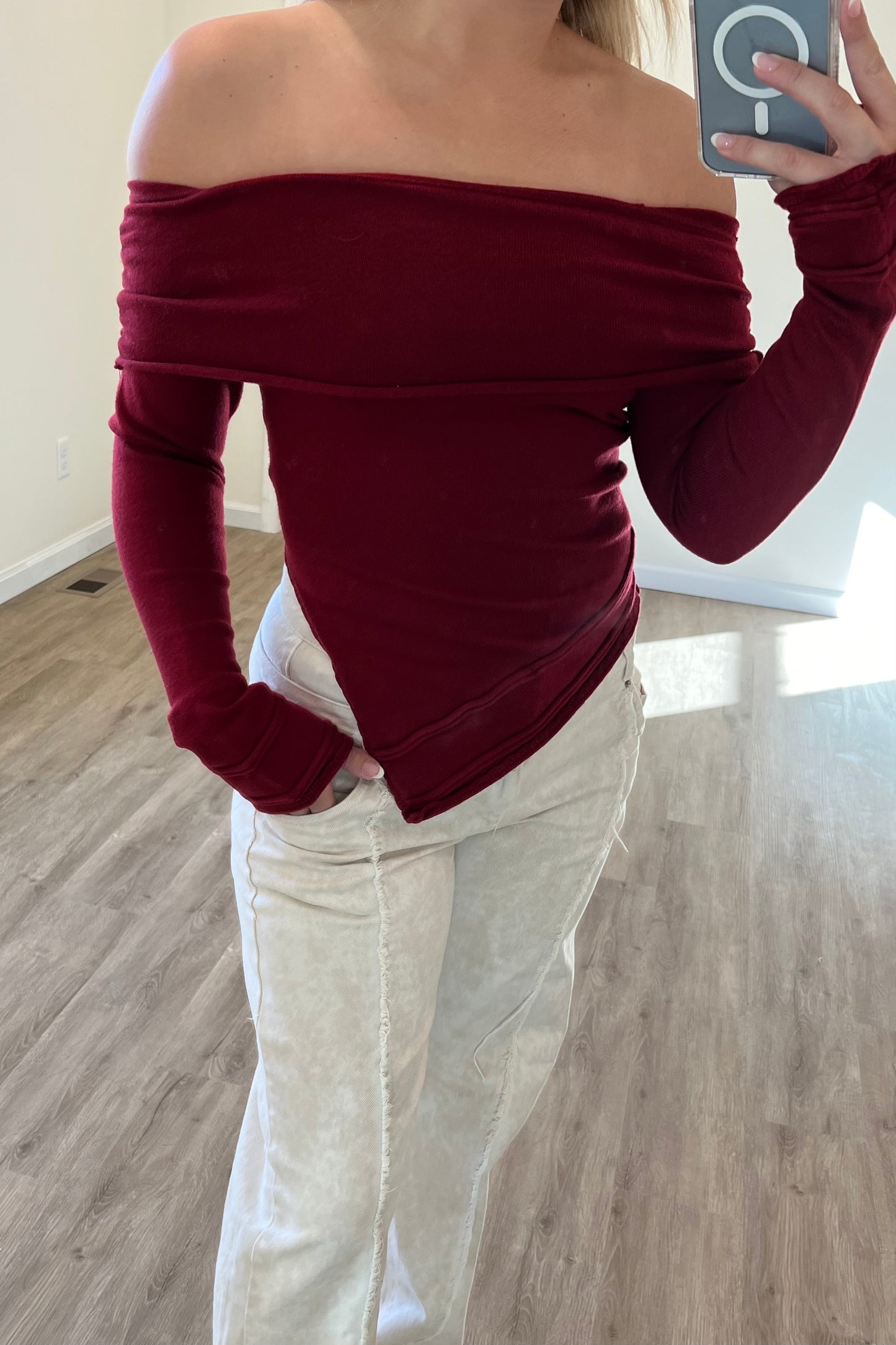 Burgundy off the shoulder sweater top with ruched detailing. Asymmetrical side slit.