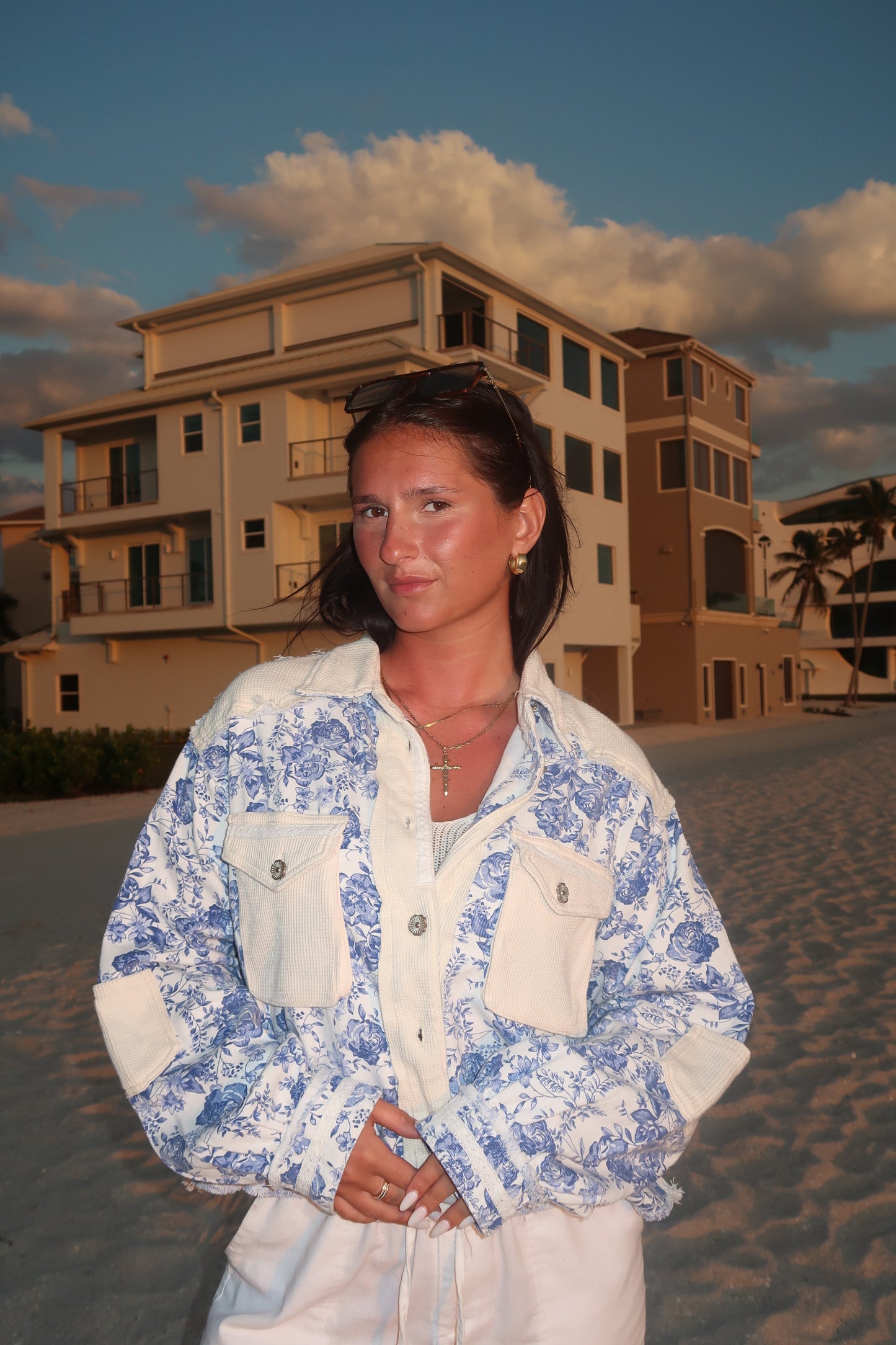 This vintage inspired, lightweight, floral jacket is a must for all season long.