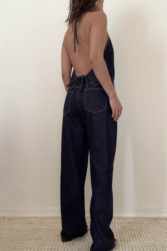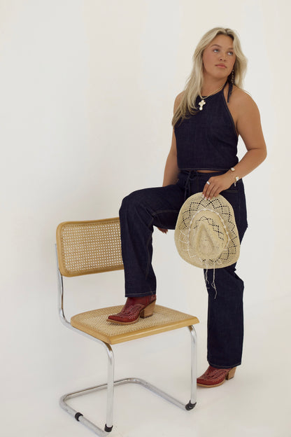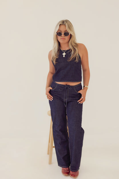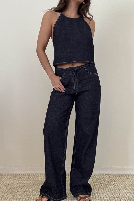 Dark denim matching set. Halter back tie top. Relaxed low waist tie pants.