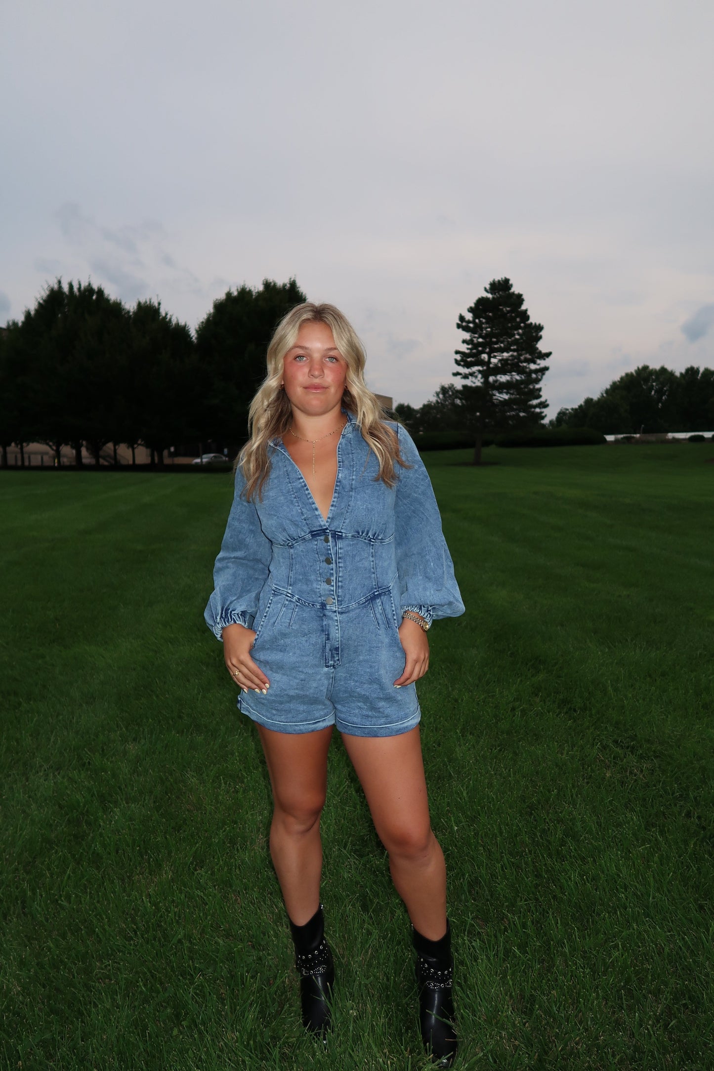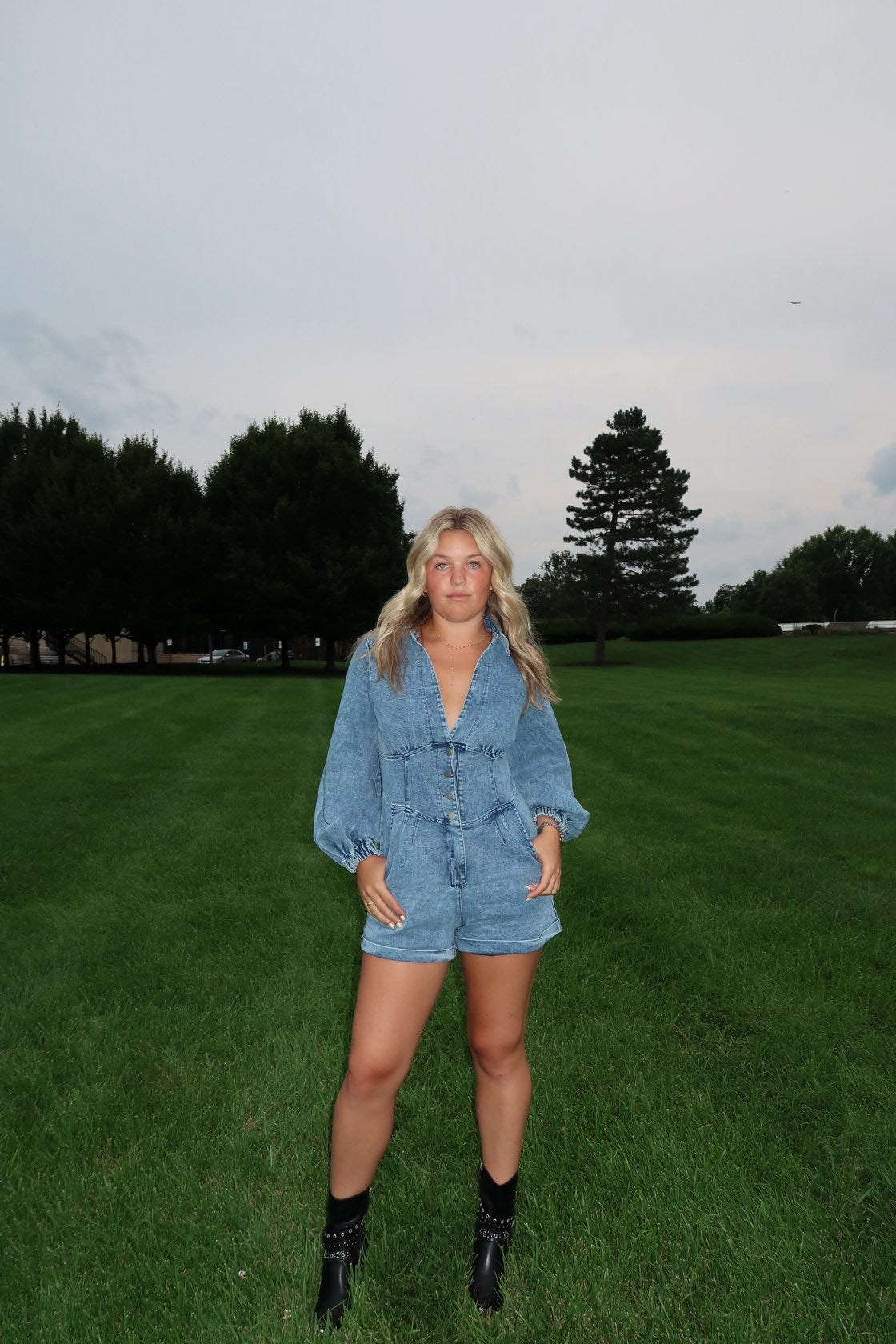 Mid wash denim romper. Balloon long sleeves. Collared neckline & front pockets.