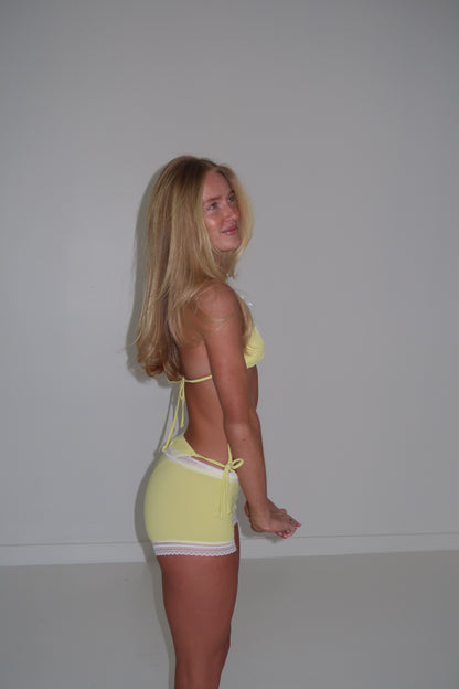 Adjustable triangle top & tie bottoms. Butter yellow soft ribbed fabric & lace trim detailing. Cover up short is same material as bikini.