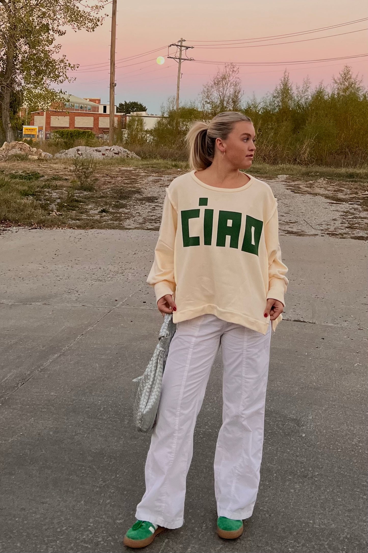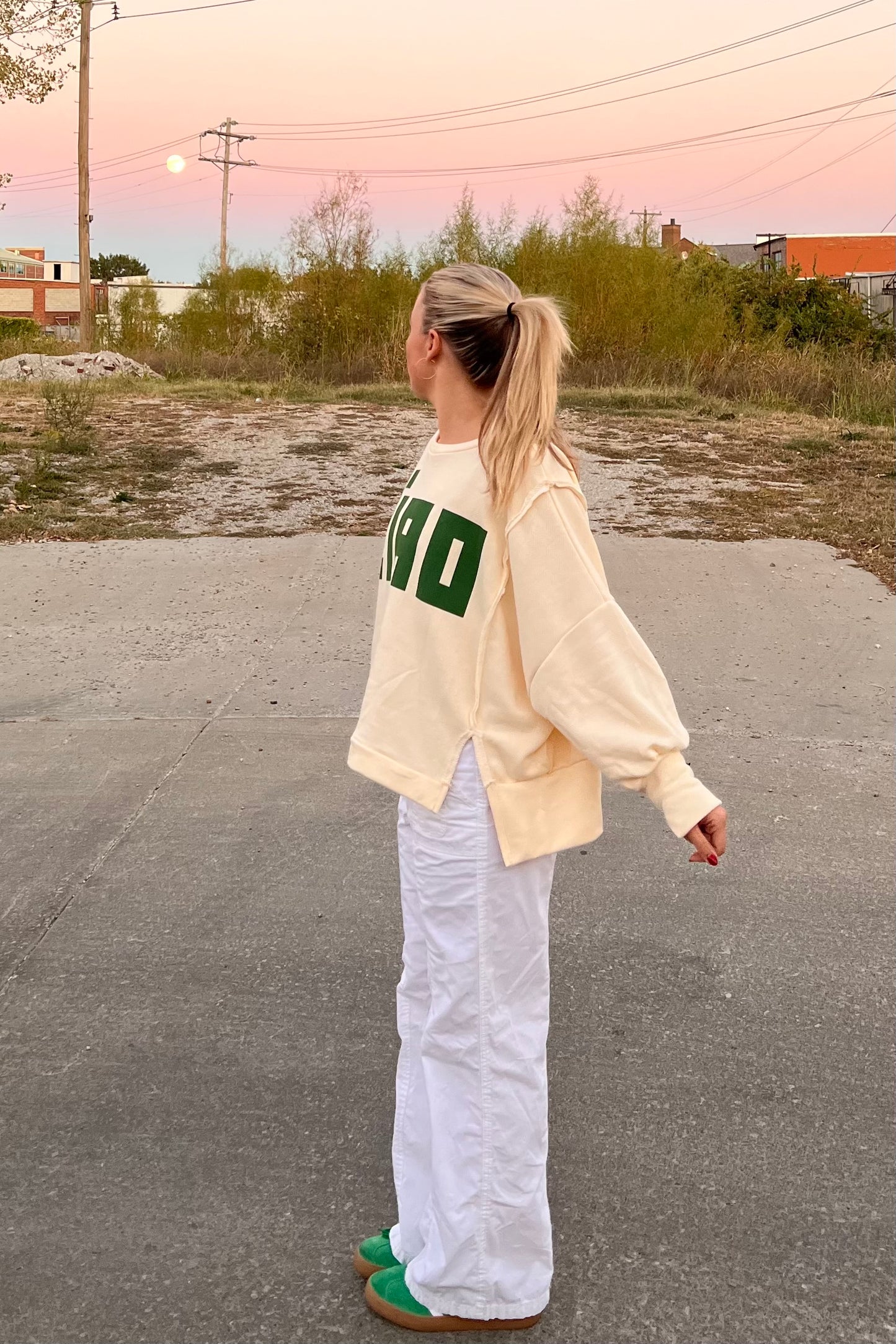 Boat neckline - Long drop-shoulder sleeves - Side slits - High-low hemline - Cropped silhouette