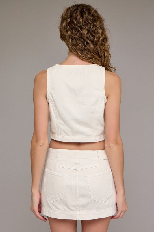 14" Low Rise Mini Skirt with Front Pockets and center front zipper. Ecru color.