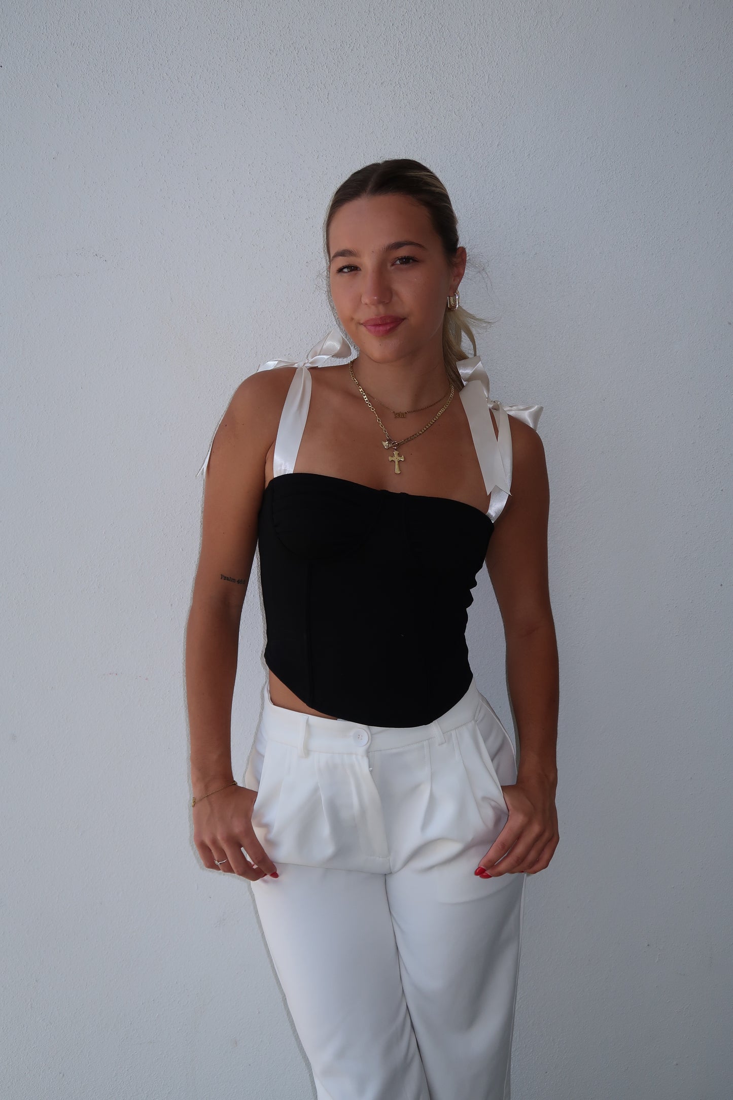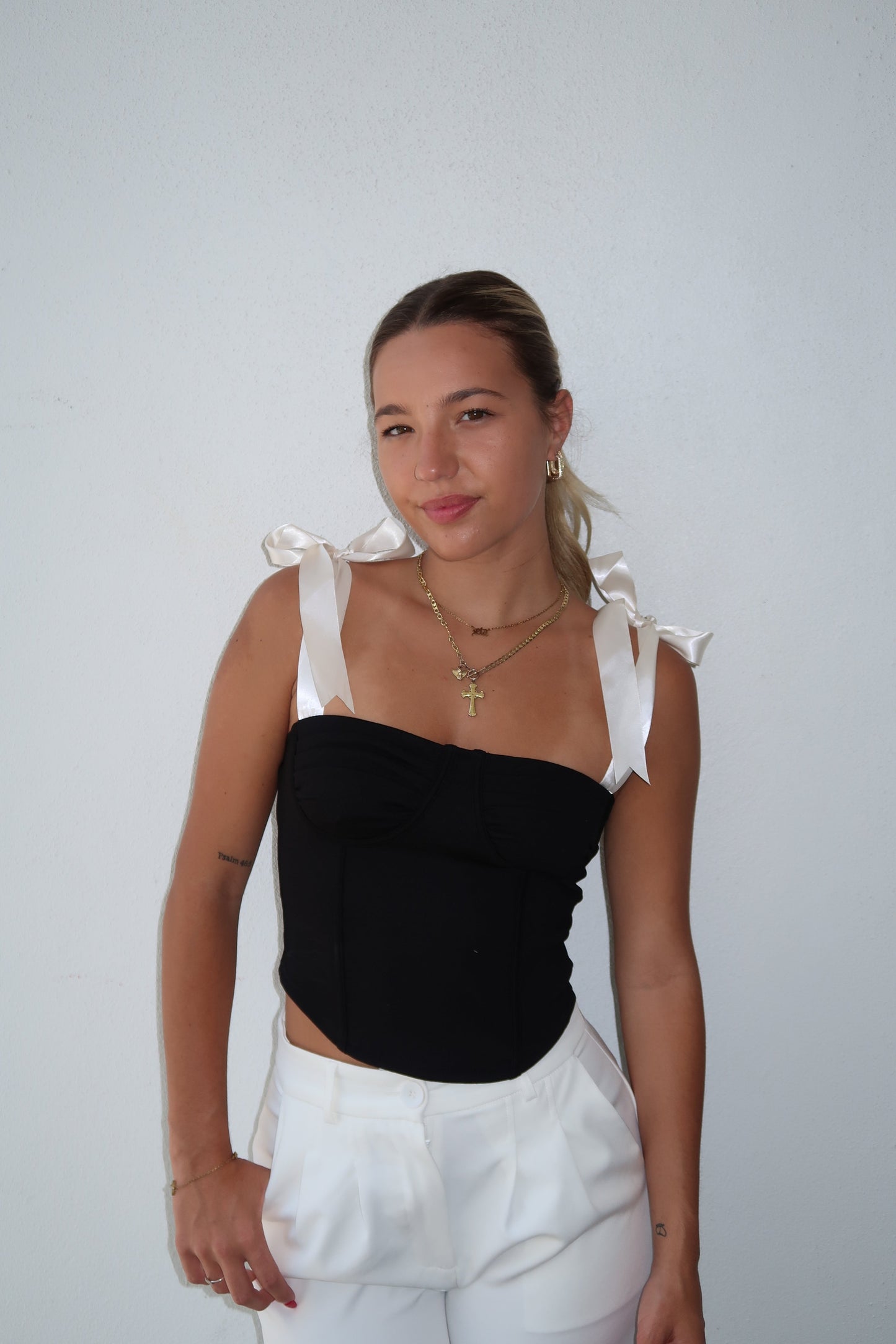 Corset top with boning. Satin ribbon straps. Ponte fabric.
