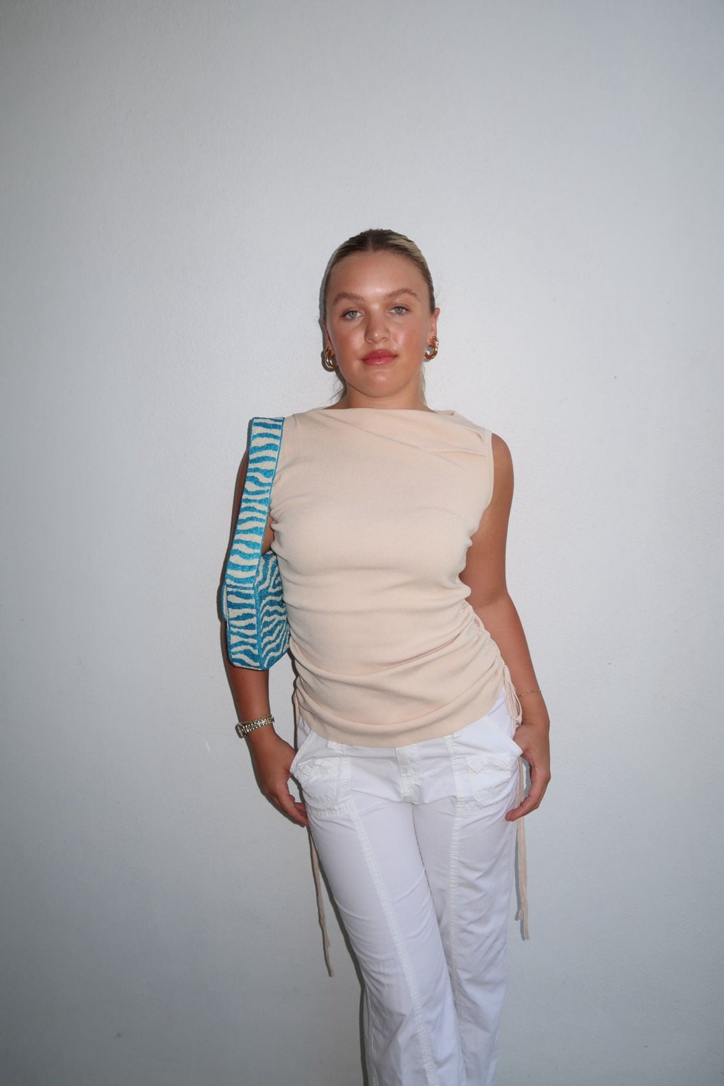 Ruched knit top. Asymmetrical neckline. Adjustable tie sides.